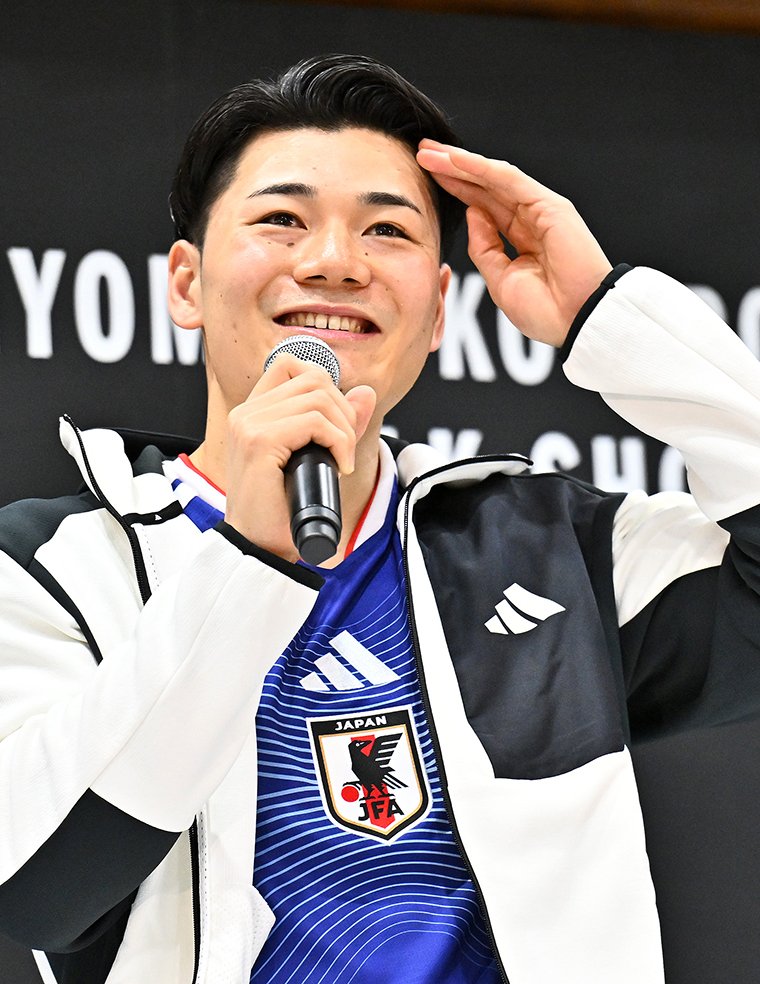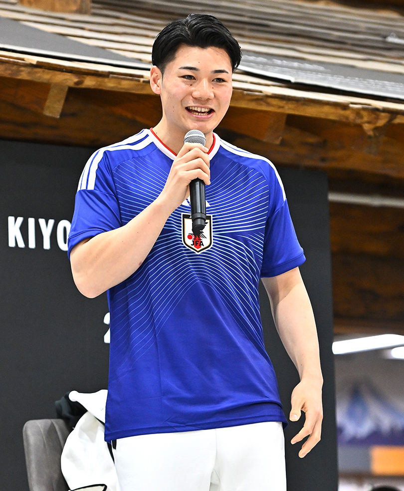 清宮が契約を結んでいる、アディダス社によるイベントで、トークの最中には上着を脱いで、来年6月に開幕するサッカーW杯で日本代表が着用する新ユニホーム姿になるというサプライズを披露。「『ベスト8の壁』があると思いますけど、みんなでこれを着て、ひとつになって戦えたら」と、森保ジャパンへのエールを口にしていた。