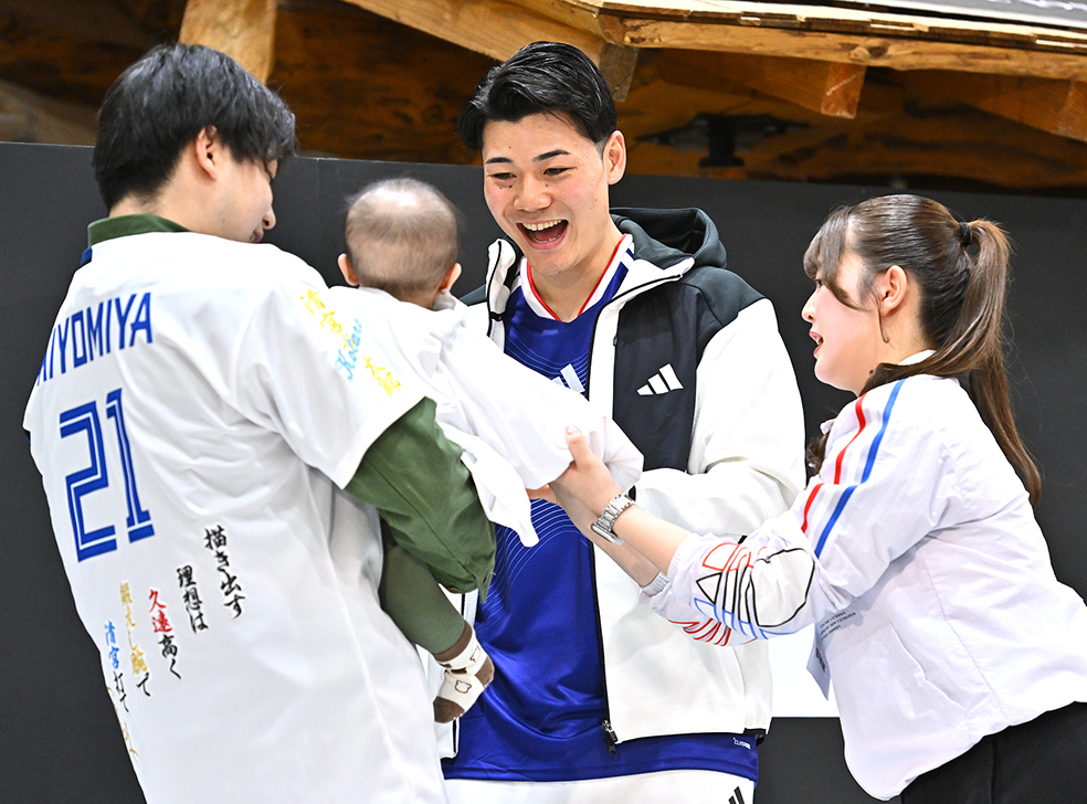 プレゼントコーナーで赤ちゃんを見て、笑顔の清宮幸(中央)