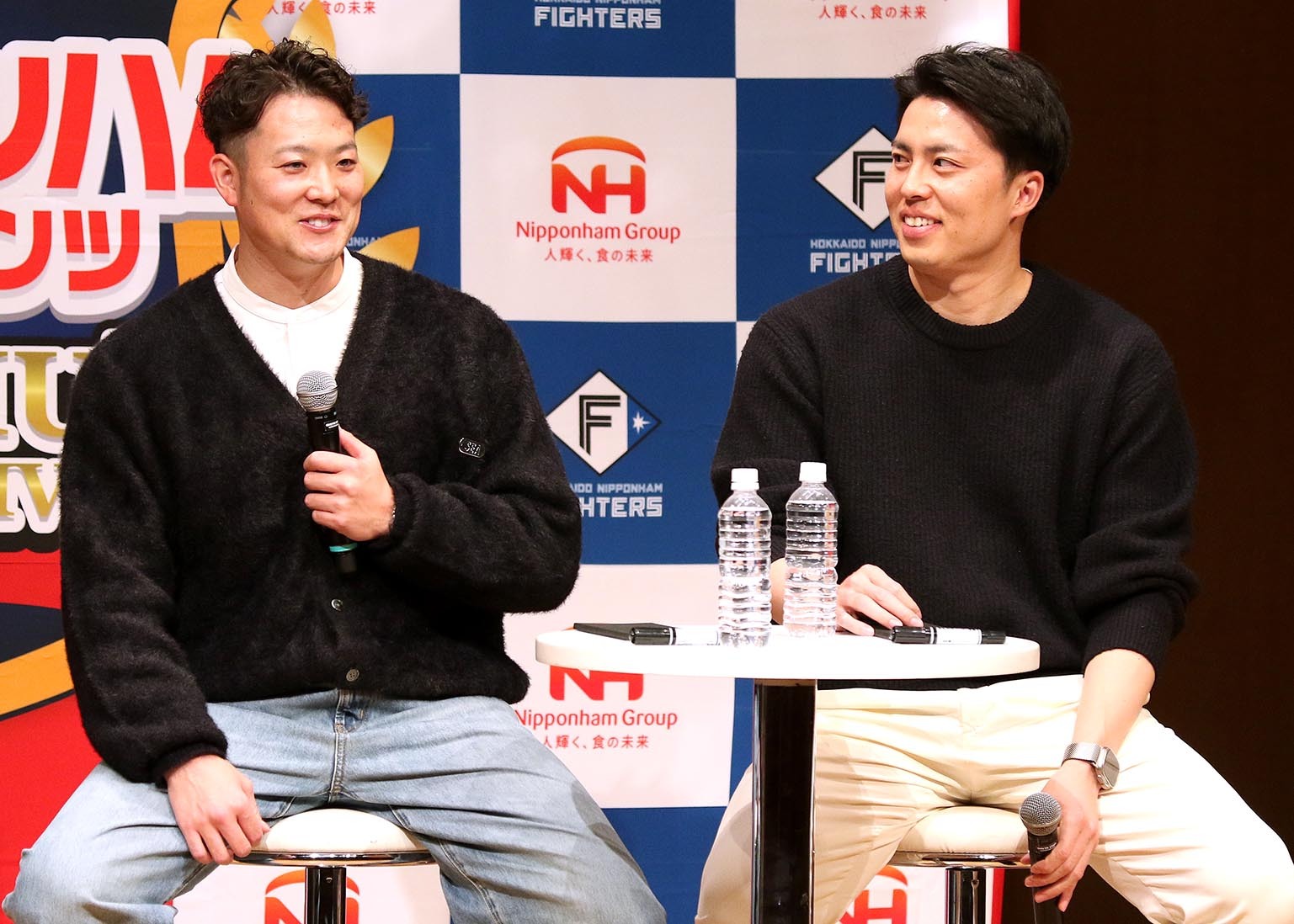取材後に行われたトークショーでは、天然キャラクターで知られる斎藤の〝通訳〟を田中が買って出るなど大盛り上がり。来季の目標について、田中が「50試合(登板)は当然クリアして、来年は数字より田中正義がファイターズに来てくれて良かったと思ってもらえるように、笑顔でシーズンを終えられるように頑張ります」と答えれば、斎藤も「自分も正義と同じように、ファイターズに来て良かったなと思うようなシーズンを来年送りたいです。数字はやることをやれば勝手についてくると思うので、しっかりみなさんに優勝を届けられるようにしたいです」とコメントした。