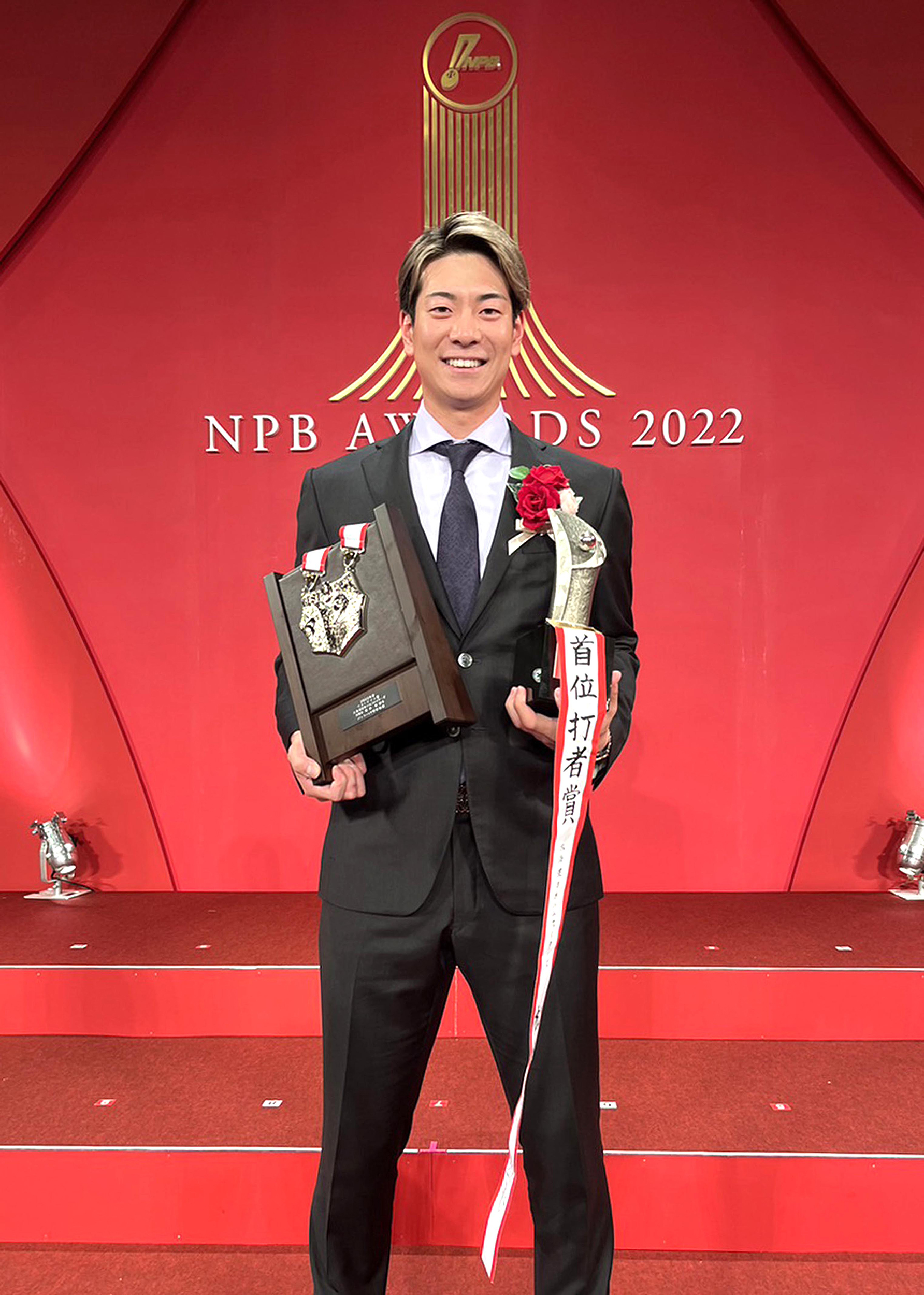 ④2022年に自身初タイトルとなる首位打者に輝き、プロ11年目でブレーク。NPBアワードに登壇