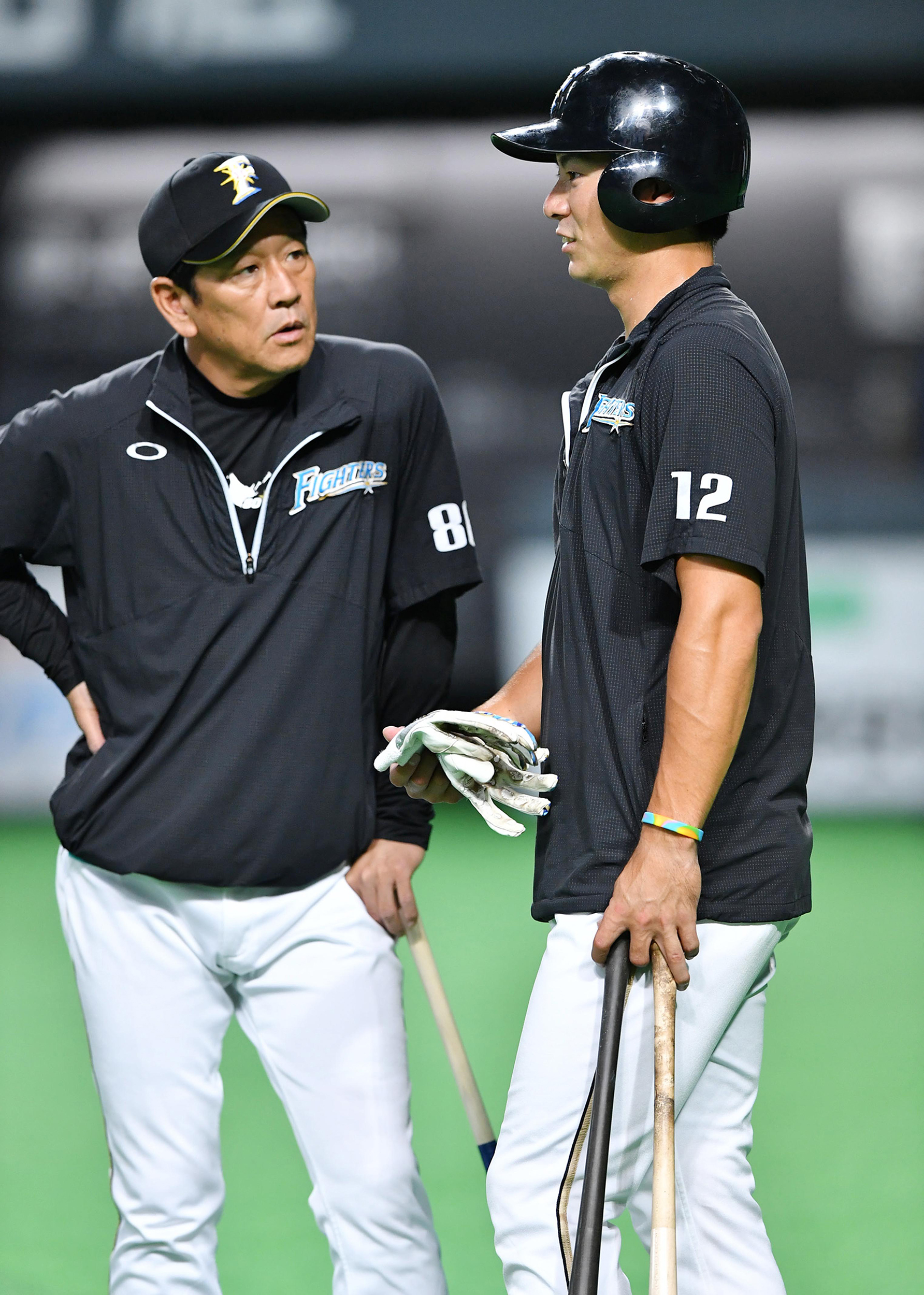 2018年、練習中に栗山監督(左)と話す松本剛