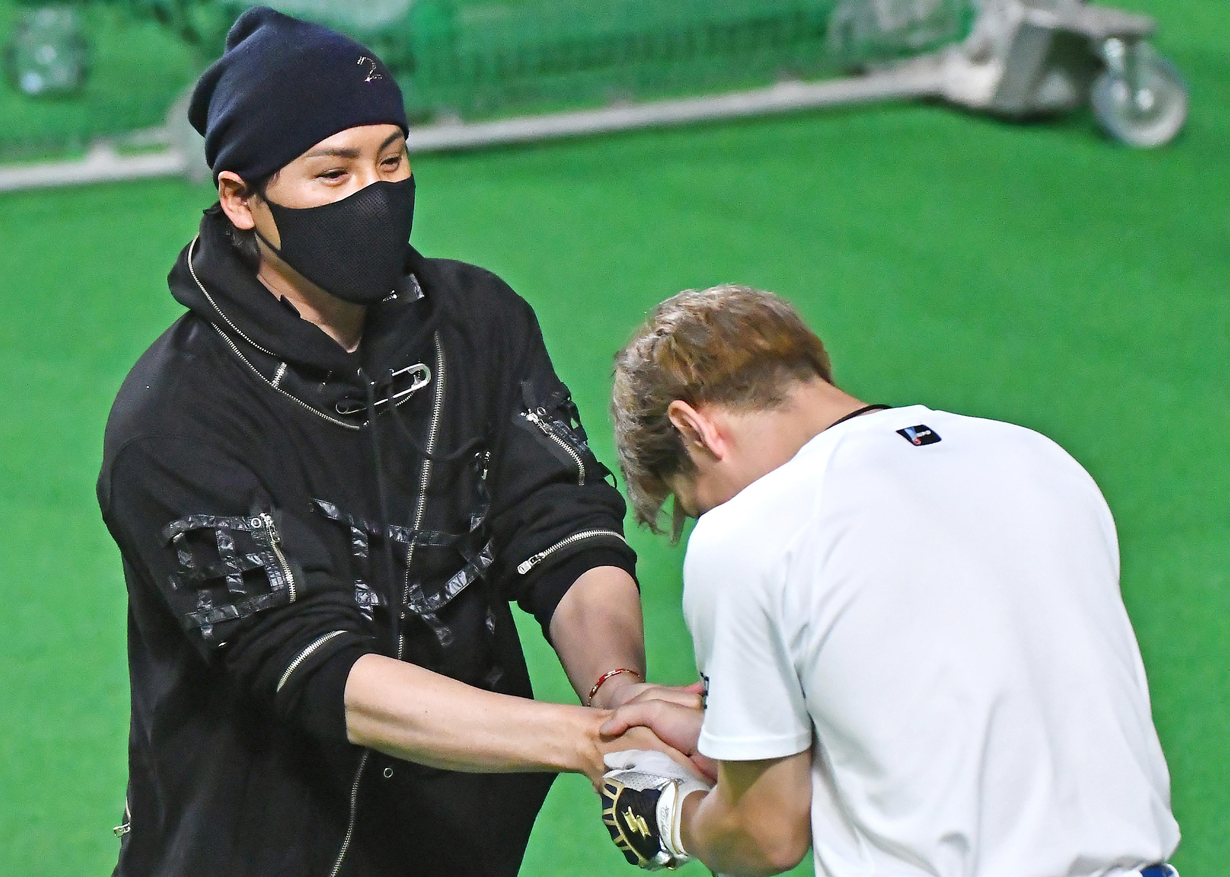 2022年、練習中に新庄監督(左)とがっちり握手を交わす松本剛