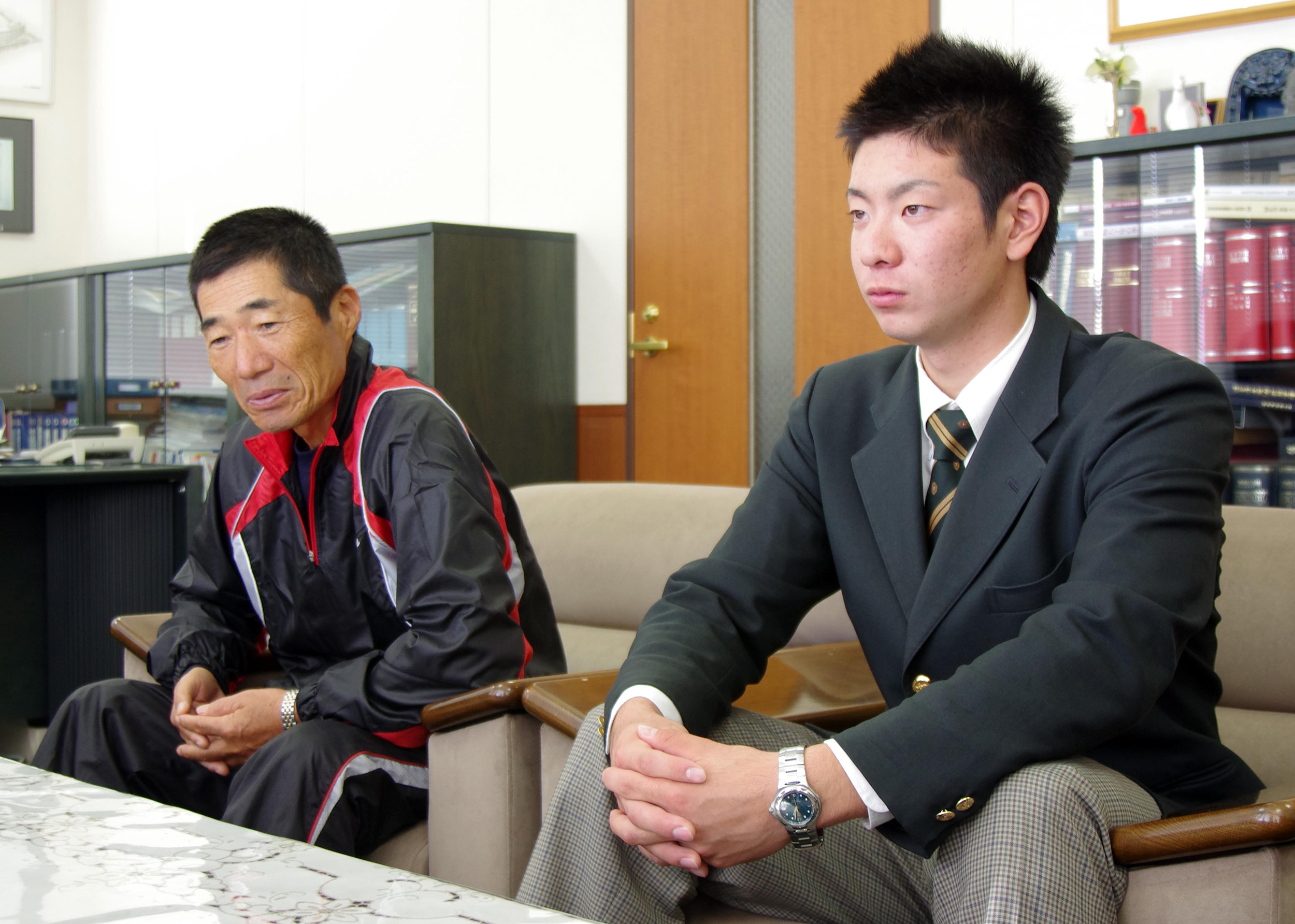 2011年11月1日、ドラフト2位指名の帝京高・松本(右)は、前田三夫監督とともに日本ハムの指名あいさつを受けた