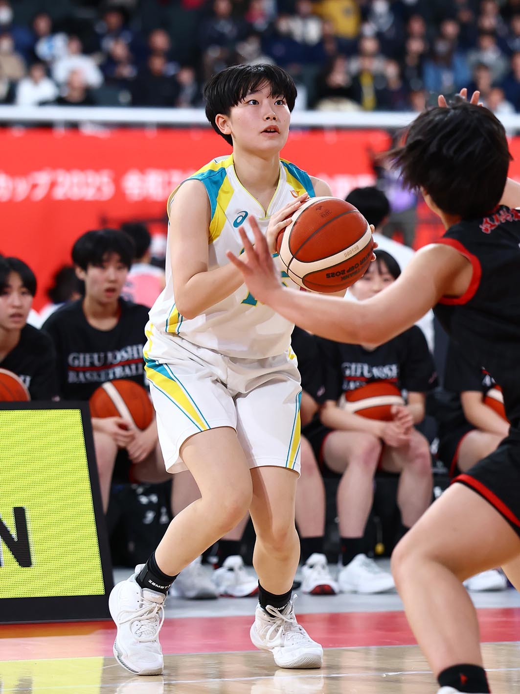 前日の1回戦同様、試合開始から連続失点して出遅れた。第2Q途中までに25-36と一気に引き離されたが、ここで古賀がドライブで切り込んだ中道美空(2年)からのキックアウトのパスを左コーナーで受けると3点シュートを決めてこの試合初得点。さらに2点シュートも確実に決め、5点差に追い上げて前半を折り返した。古賀は1回戦は5得点。2倍となる10得点の活躍に「ジャンプシュートとかスリーとかシュートが得意。昨日より良くなってる。いつも逃げてしまってた時に、上島さんに怒られることが多くて、負けないように気持ち強くしてできました」と、声を弾ませた。