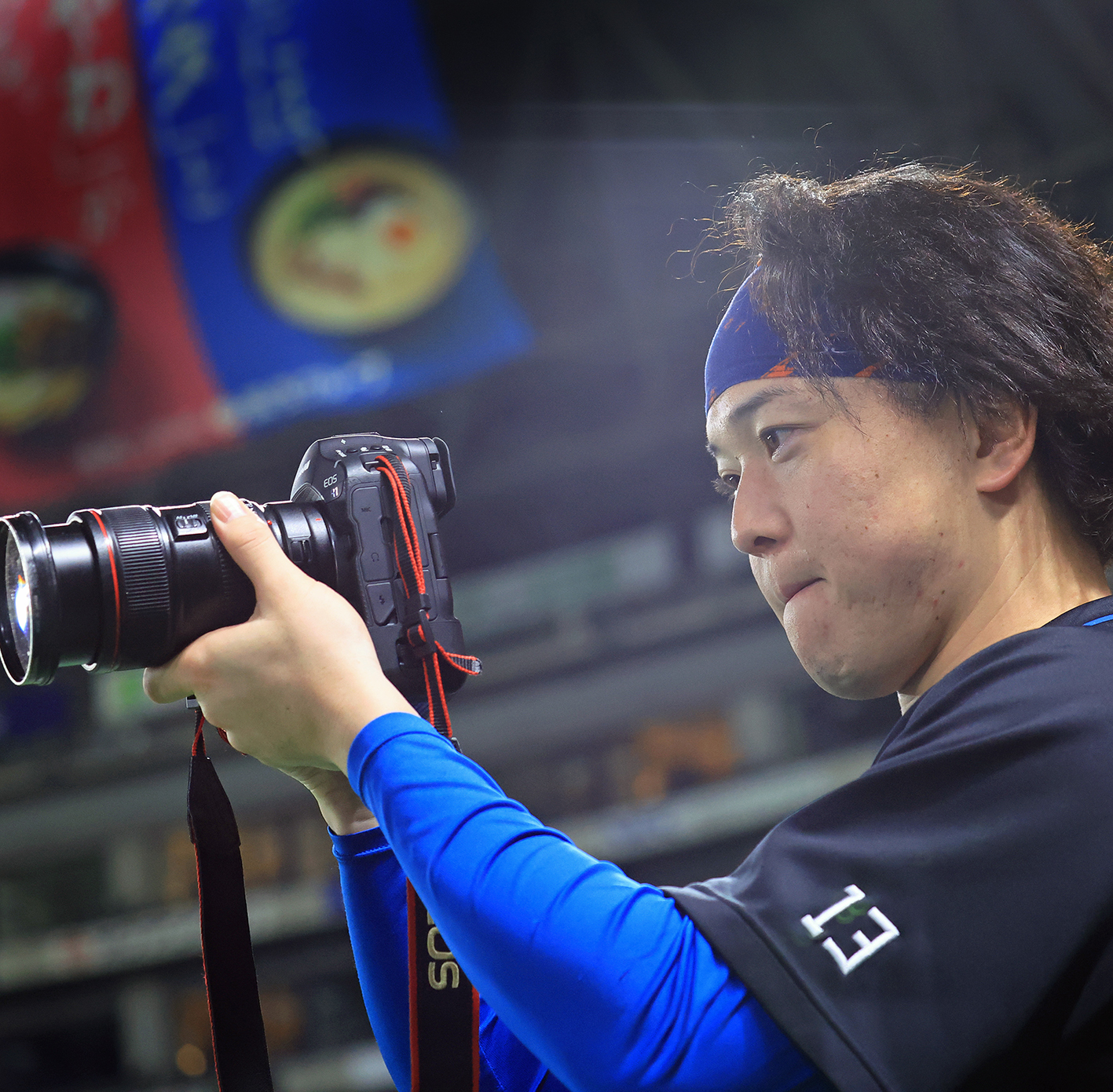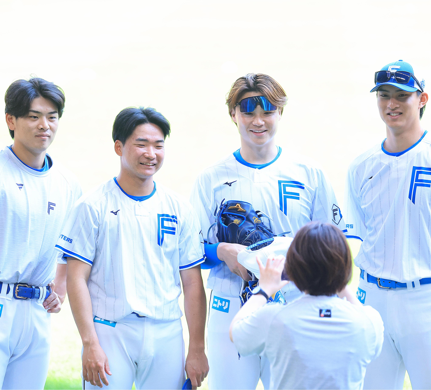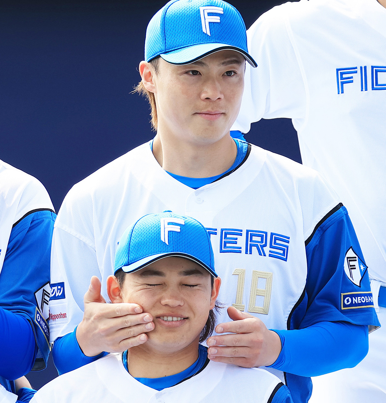 ルーフオープンで行われたエスコンでの練習日。野村、山県、山崎、達が、球団SNS用の写真撮影に応じていた。一見つながりがなさそうに見えるこのメンバー。同じタイミングでグラウンドに出てきたという偶然が重なり、レアな4ショットが実現したようです。