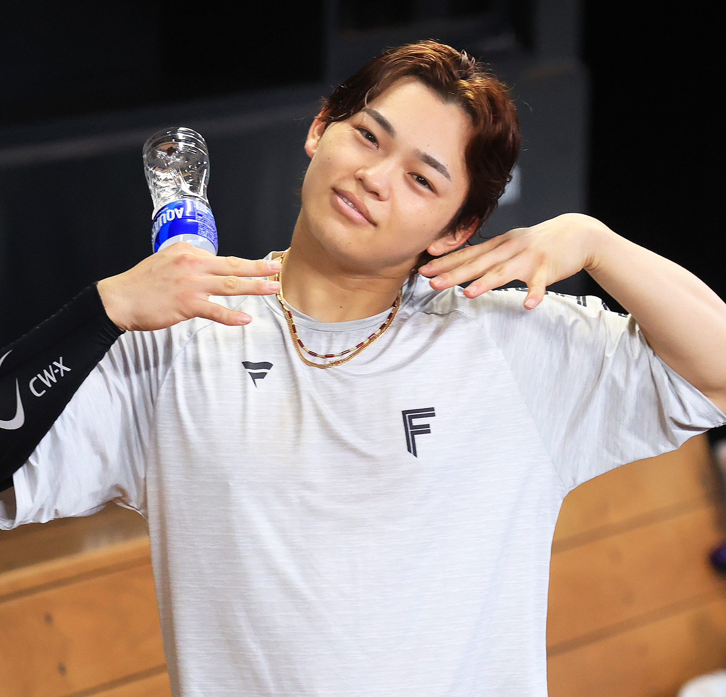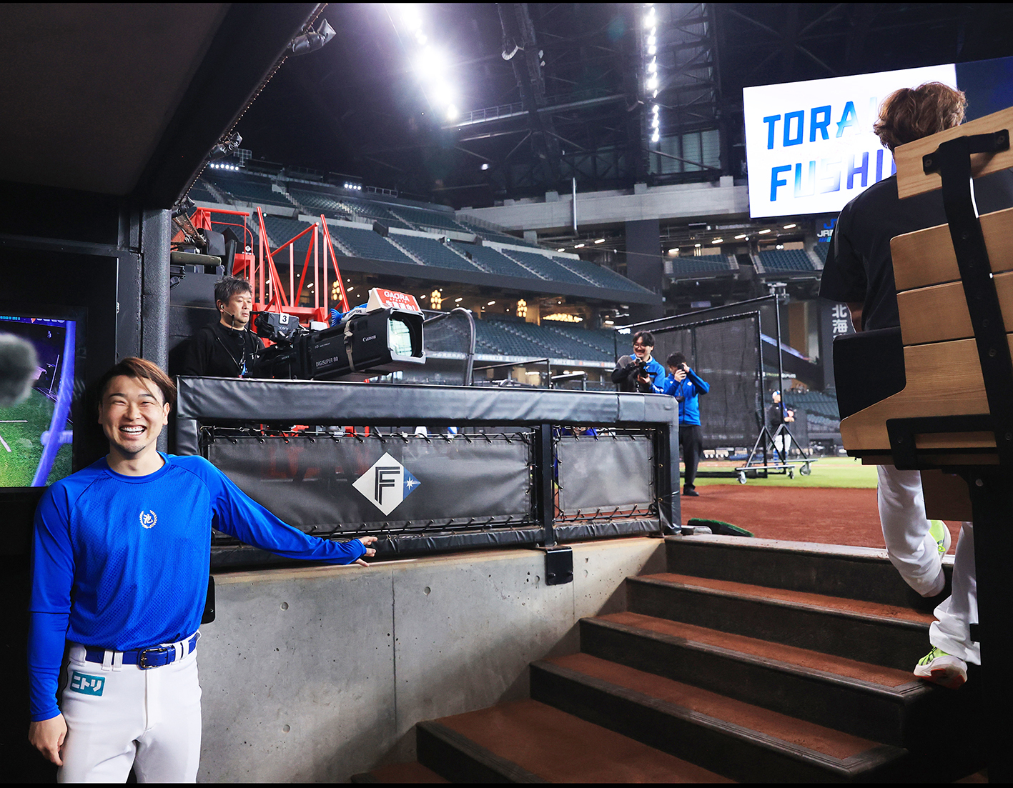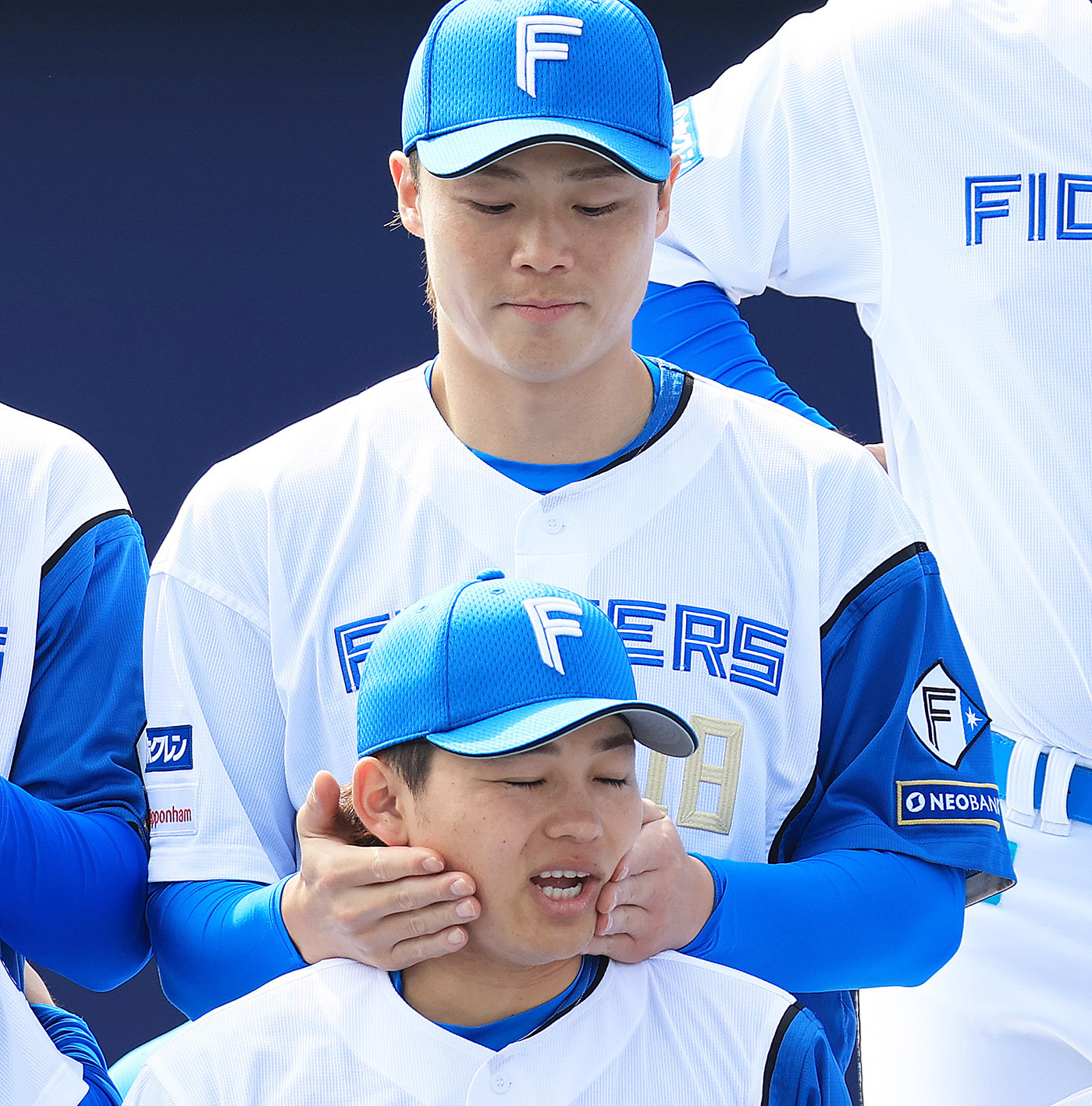 ルーフオープンで行われたエスコンでの練習日。野村、山県、山崎、達が、球団SNS用の写真撮影に応じていた。一見つながりがなさそうに見えるこのメンバー。同じタイミングでグラウンドに出てきたという偶然が重なり、レアな4ショットが実現したようです。