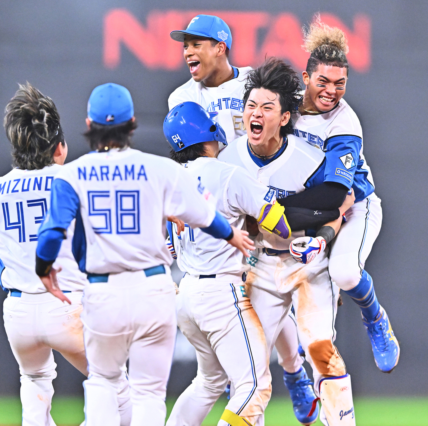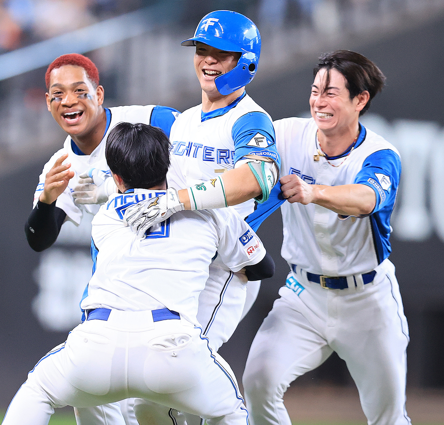 2点ビハインドの九回に野村が、劇的な逆転サヨナラ二塁打をマーク。雄叫びをあげるヒーローに、万波、水谷、田宮、奈良間と同学年の仲間たちがうれしそうに駆け寄った。同い年のまとめ役を担っており、〝同級生会〟では幹事を務めるなど頼りになる存在。このオフのトークショーでは金村が「飯とかも場所とかも何時にここみたいな。食べられないもの、アレルギーいる?みたいなことも全部LINEでバーって来て」とエピソードを披露していた。