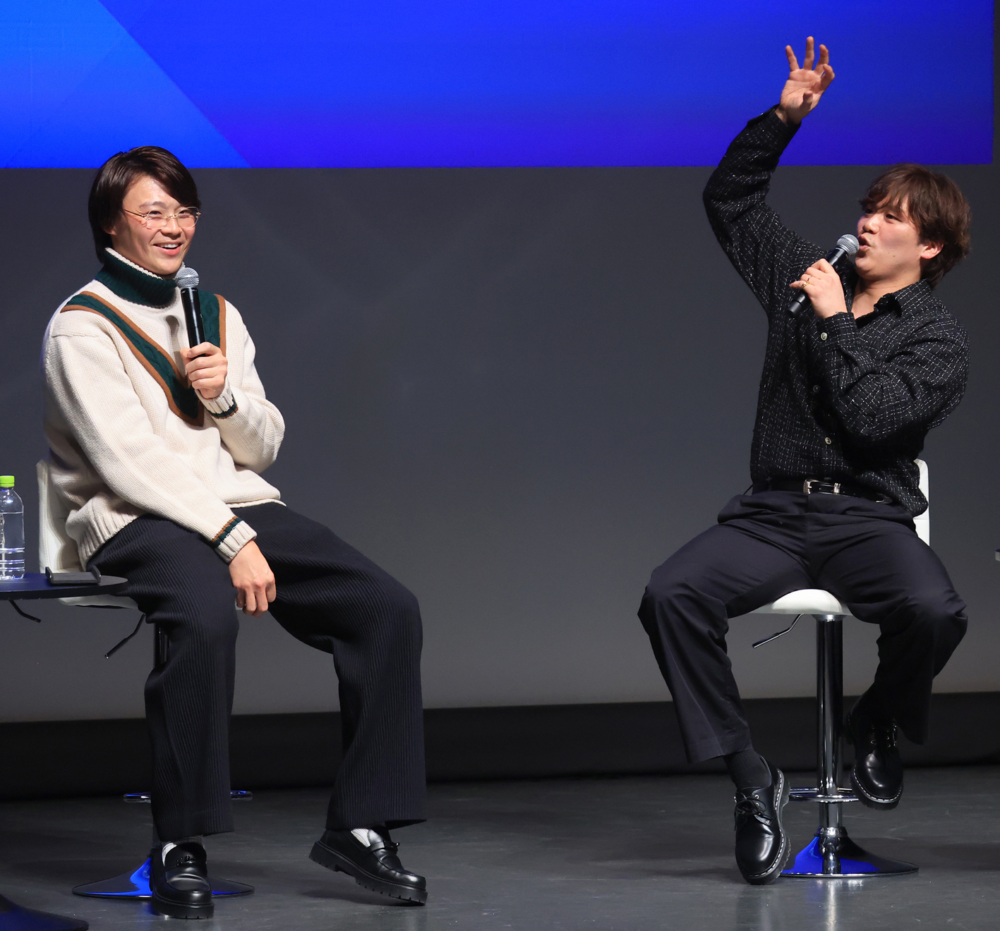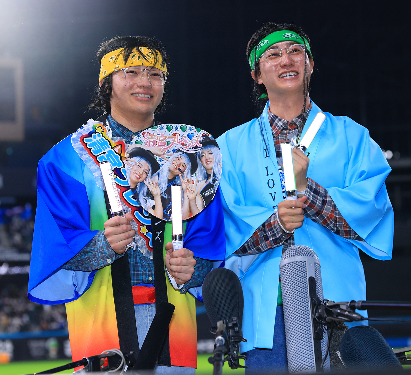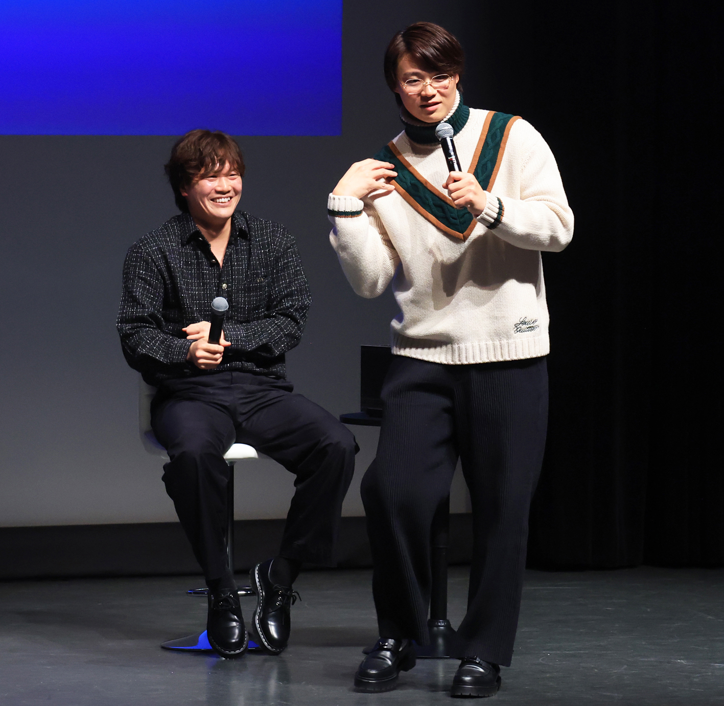 チーム集合写真を撮影する際に、いちゃつく〝ゆあさち〟をカメラマンは見逃さなかった。今月15日に行われたイベントでは、ほんわかした雰囲気でじゃれ合っていることを明かし、仲睦まじいトークを展開。この日のように山崎が田宮の頬をつかむシーンを実演し、会場から大きな歓声が上がった。