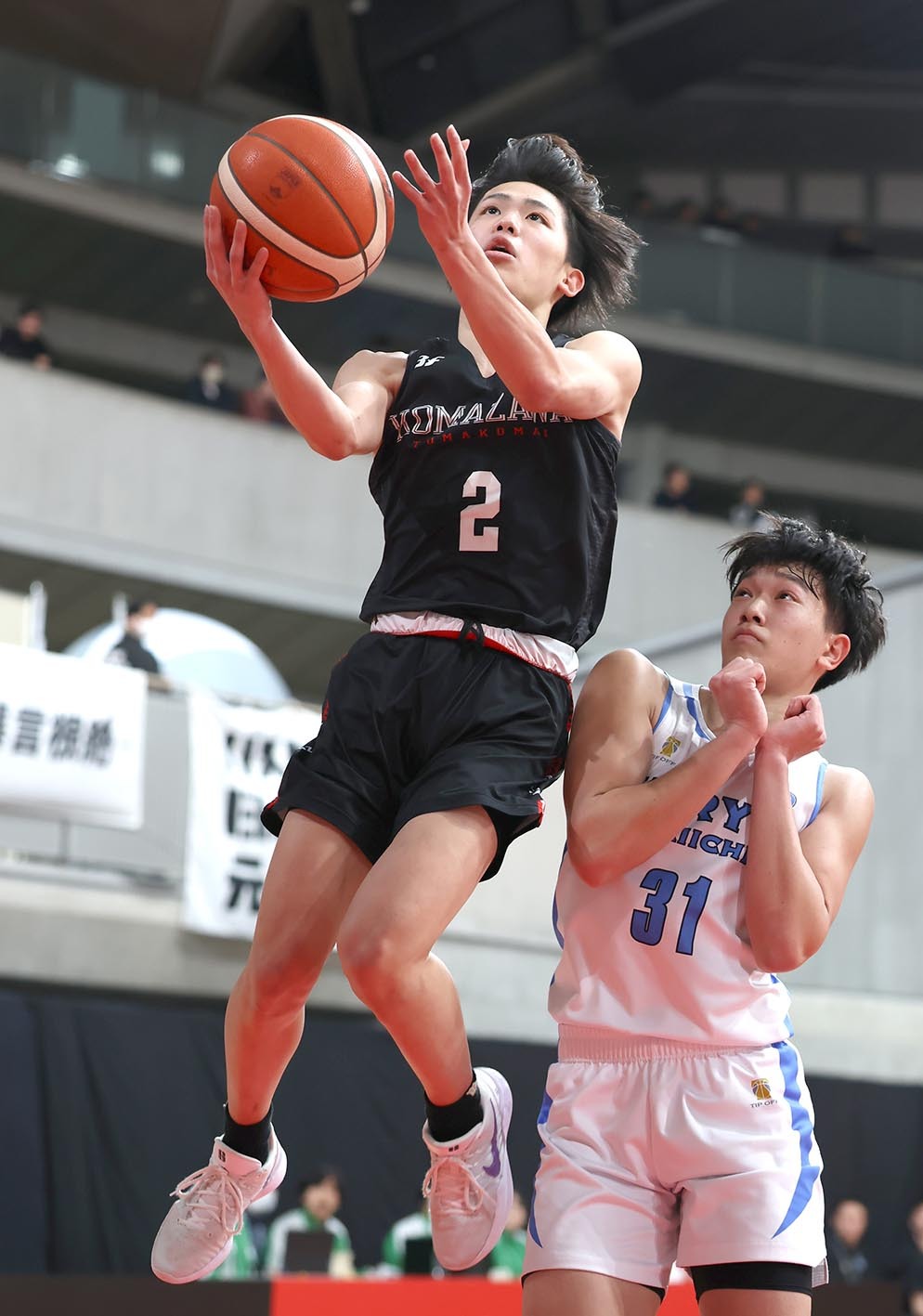 第1Q、ゴール下でシュートを決めにいく駒大苫小牧の宮森=撮影・中本翔