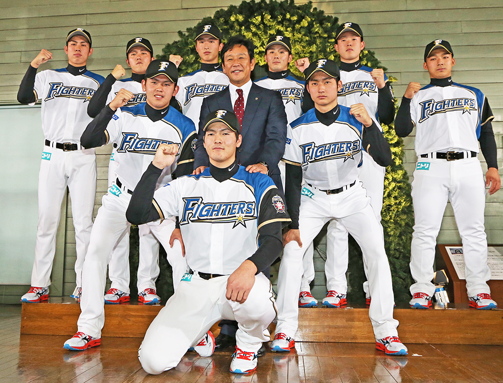 有原(最前列)や浅間(2列目右端)ら2015年の新加入選手と栗山監督(2列目中央)