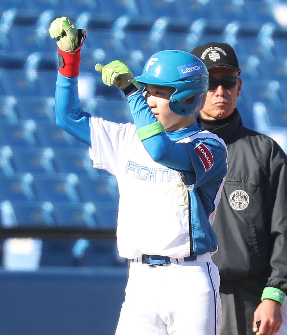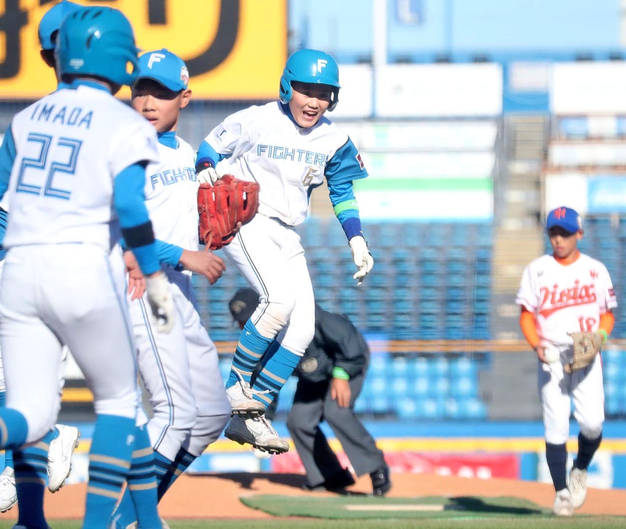 日本ハムジュニアは9-0の四回2死二塁から丹波主将(中央)の中前打でコールド勝ちを決めた
