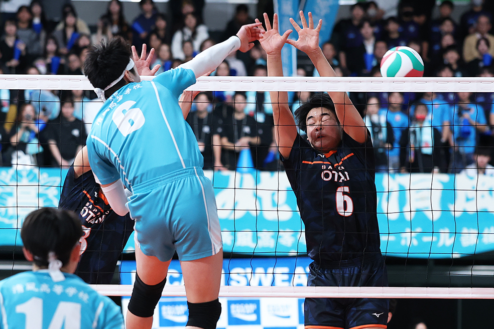 第2セット、札幌大谷の三谷(右)が懸命にブロックするもスパイクを決められて得点を許す