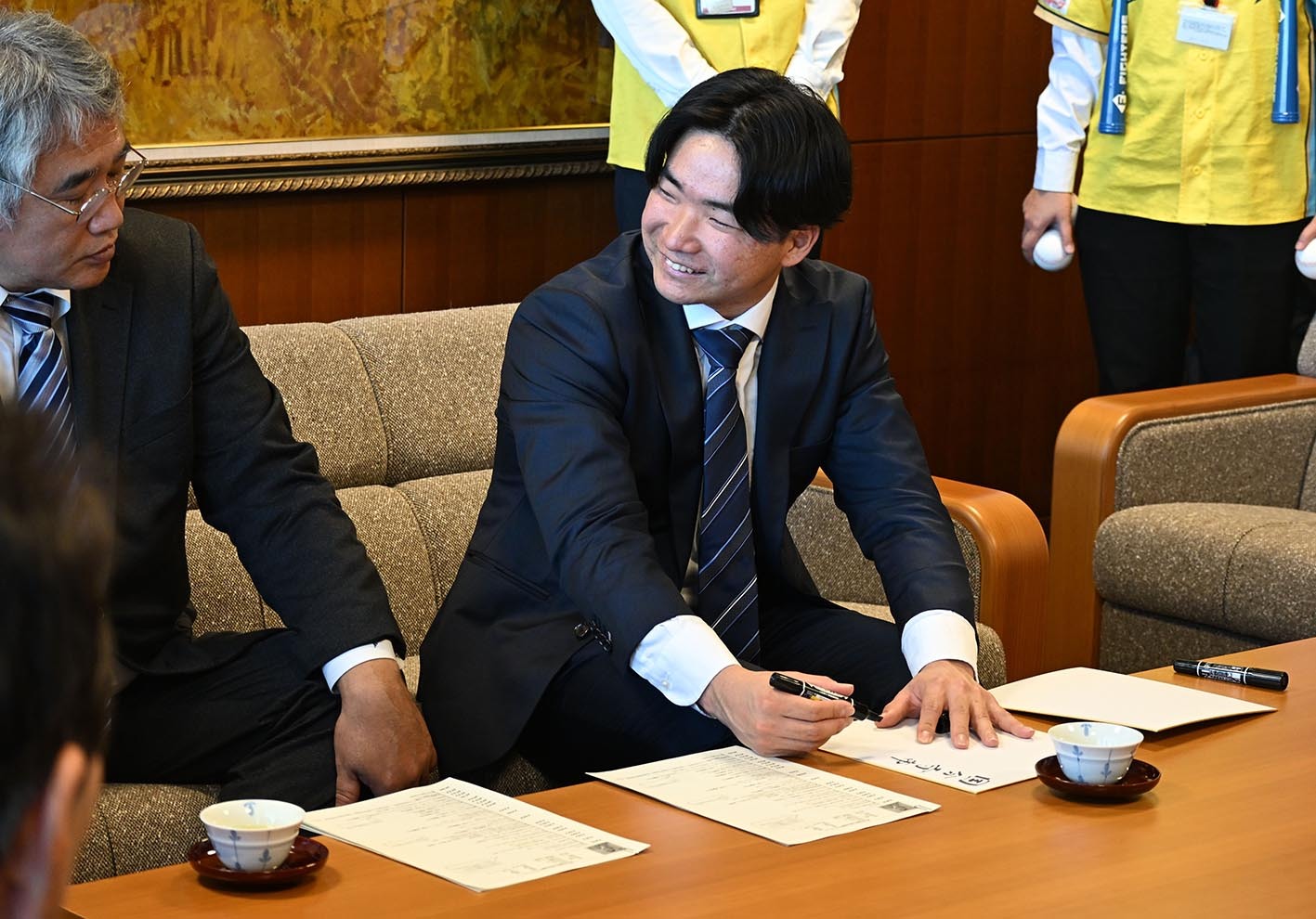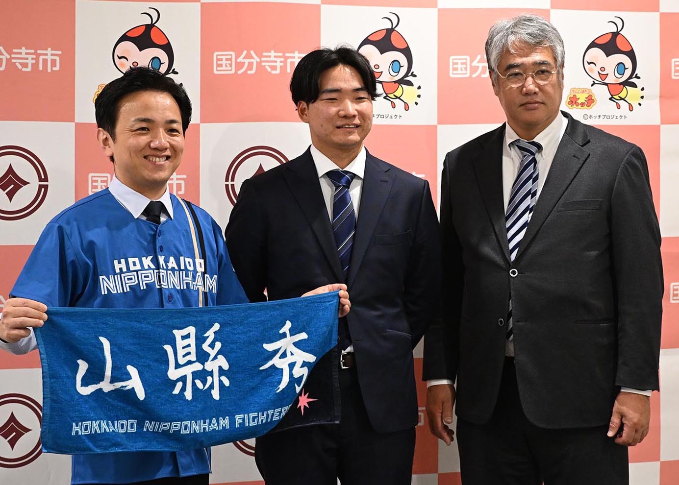 東京・国分寺市出身の日本ハム・山県秀内野手(23)と木田優夫GM代行(57)が9日、同市役所を表敬訪問した。