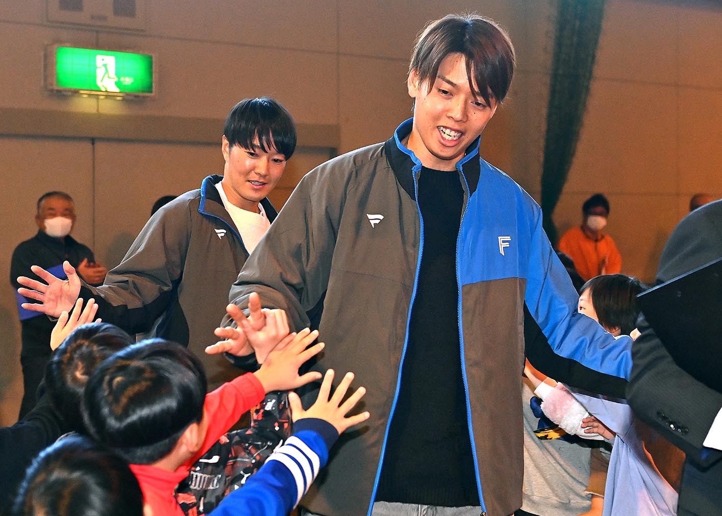 杉浦「何かあったかなー。メシも行ってはいますけど、思い出は出てこない(笑)。ちょっと待ってくださいね…。玉井と長くいるのは、オフシーズンかな。今でこそ札幌組(オフに札幌でトレーニングする人)が増えましたけど、ちょっと前は少なかったので、数少ない札幌組だったんですよ。僕と玉井、加藤(貴)、(中島)卓さんぐらいだったかな。オフシーズンなので、練習に行ったら、だいたい誰かしらがいて、昼(メシ)を食いに行ったりはあるんですけど、ほかにあるかな。基本はおごっていましたけど、あいつのうまいところは、練習とかだと毎日、メシに行くので、『ここは僕が出します』、みたいなことも言ってくるんですよ。メシは僕が出して、その後ちょっとコンビニとかに寄った時に、『ここは僕が出します』みたいな感じで。僕的にはどっちでも良いんですけど、そういう気持ちを見せてくる。やっぱり社会人を経験しているからですかね。意外と2人になると、そんな別にずっとふざけているわけじゃない。2人でふざけているヤツは結構やばいじゃないですか。普通に、プライベートの、玉井の結婚式にも行ったので、奥さん同士も会っているので、そういうところはある意味、家族の付き合いはありますけど。付き合っていた頃から、ちょいちょい、なんか良いところないですか、とかはありましたよ、行くところとか。一緒にいるんですけど、プライベートはたまにぐらいなので。メシ食いに行って、これぐらい何も覚えていないような会話をして終わる。それがちょうど良いんですよ。でも、結構あいつとイベントは行っていますね。トークショーとか。あいつはそういうとこのトークでぶっ込むので。でも思い出かって言われると微妙です。おととしも行ったな。忠類か、小学校訪問、音更と幕別に行きました。忠類って、帯広ではないですけど、十勝の地元で、今は幕別町なんですけど、もともとは忠類村で、ナウマンゾウ記念館みたいなのがあったんですけど、あいつがその日着てきた服が、ゾウのデザインだったんですよ(笑)。たまたまなんですけど。だから張り切ってそこで写真撮っていましたね。ちょっと思い出には弱いけど。気付いたら、なんだかんだ一緒にいますね。年も近いし、もう気心も知れているので、なんだかんだいる時間は長いですね」