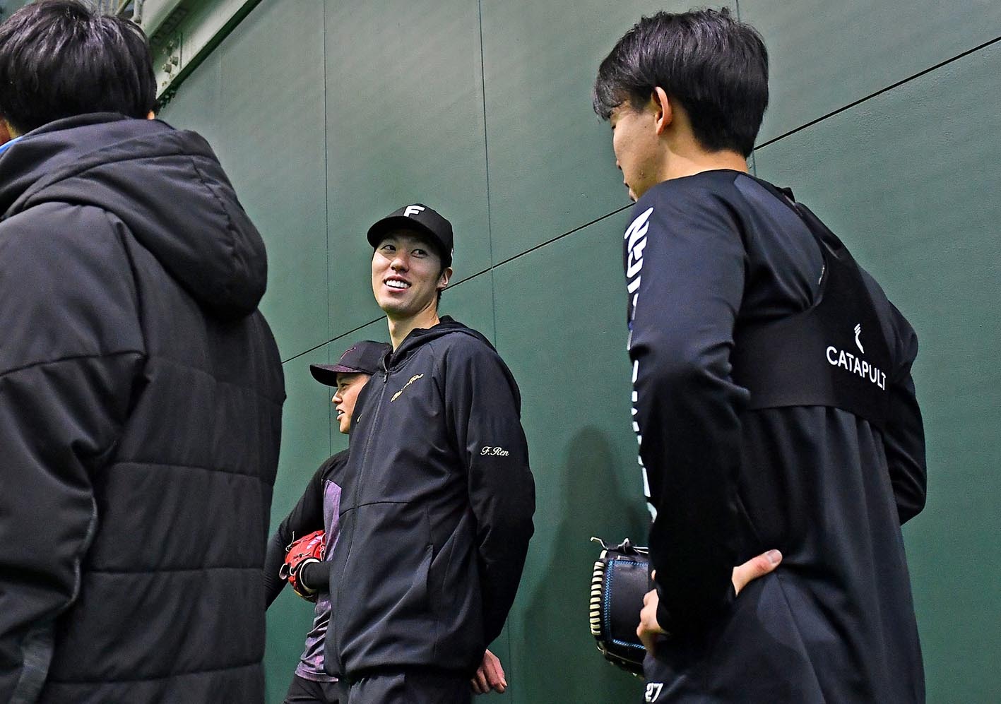 鎌ケ谷で行われている新人合同自主トレで、ドラフト1位の大川と育成2位の横山がブルペン入り。自主トレ中だった福島、畔柳、柴田らチームメートも練習の手を止めて、興味津々だった。
