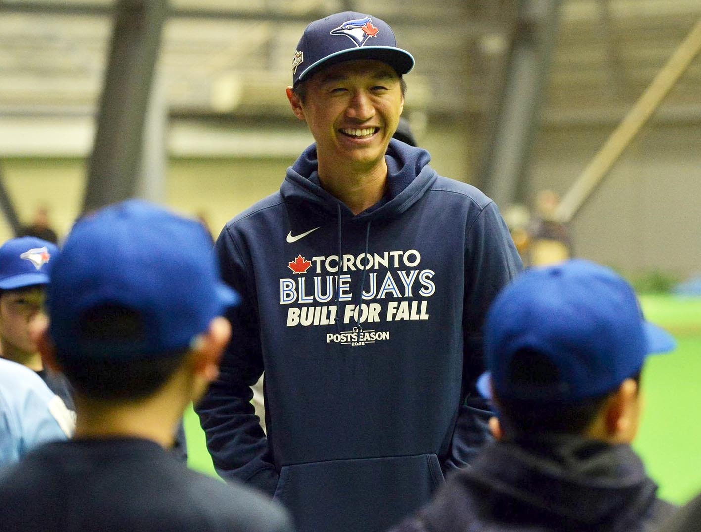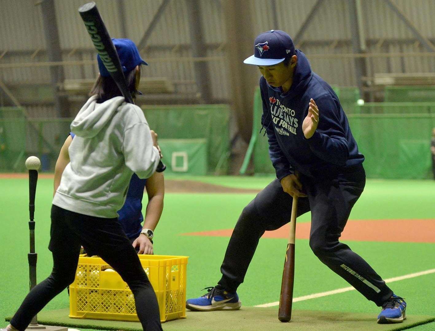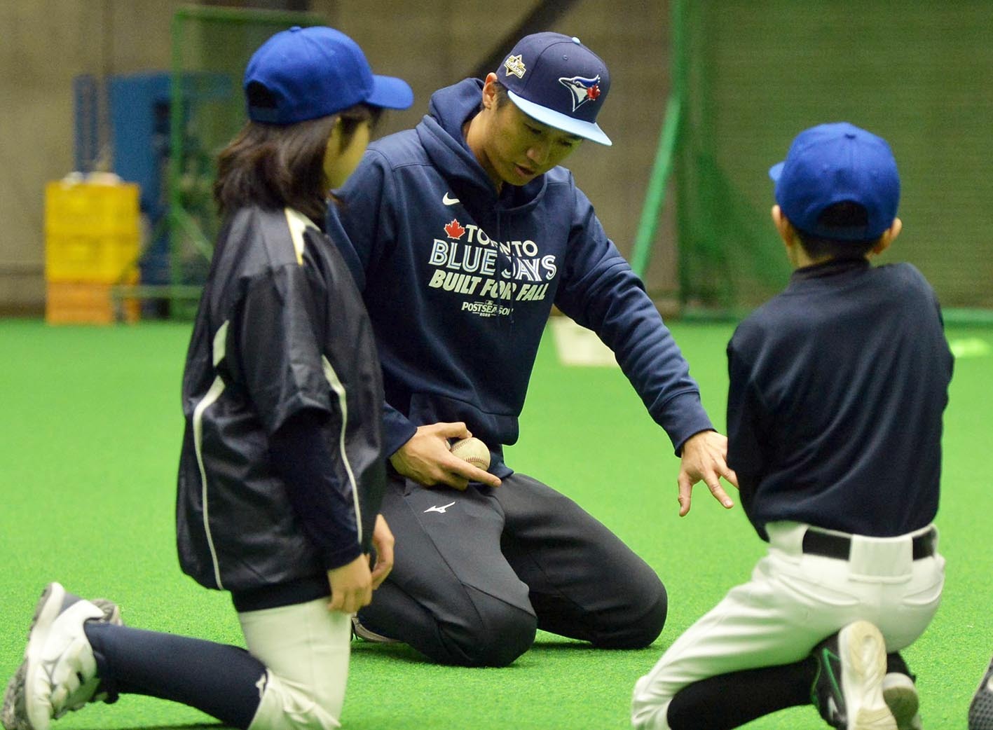 MLBトロント・ブルージェイズの戦略担当を務める元日本ハムの加藤豪将さん(31)が17日、札幌市内にある日本ハムの屋内練習場でベースボールクリニックを開催した。今夏にカナダ独立リーグに挑戦した北大大学院生の大澤楽汰(るんた)さんをゲストコーチに迎え、小学5、6年生33人に日米の経験を踏まえた技術などを惜しみなく伝授した。
