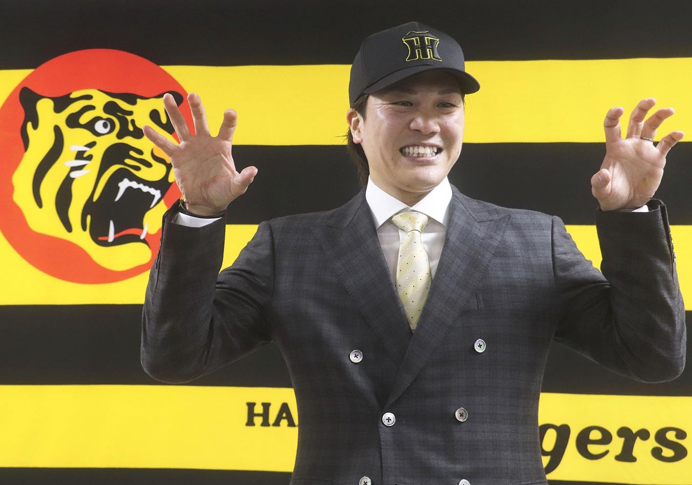 2025年11月28日、トレード加入し、会見に臨んだ阪神・伏見=共同