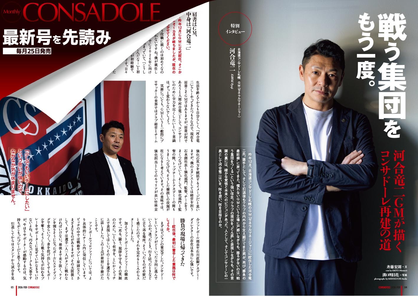 道新スポーツデジタルでは、毎月発行されている「月刊コンサドーレ」の記事の中から一部を抜粋し、発売に先がけて公開します。今回は1月25日に発売される2月号から河合竜二GM(ゼネラルマネージャー)のインタビュー「赤黒の肖像」を抜粋。記事の途中までですが、購入前の参考にしてください。