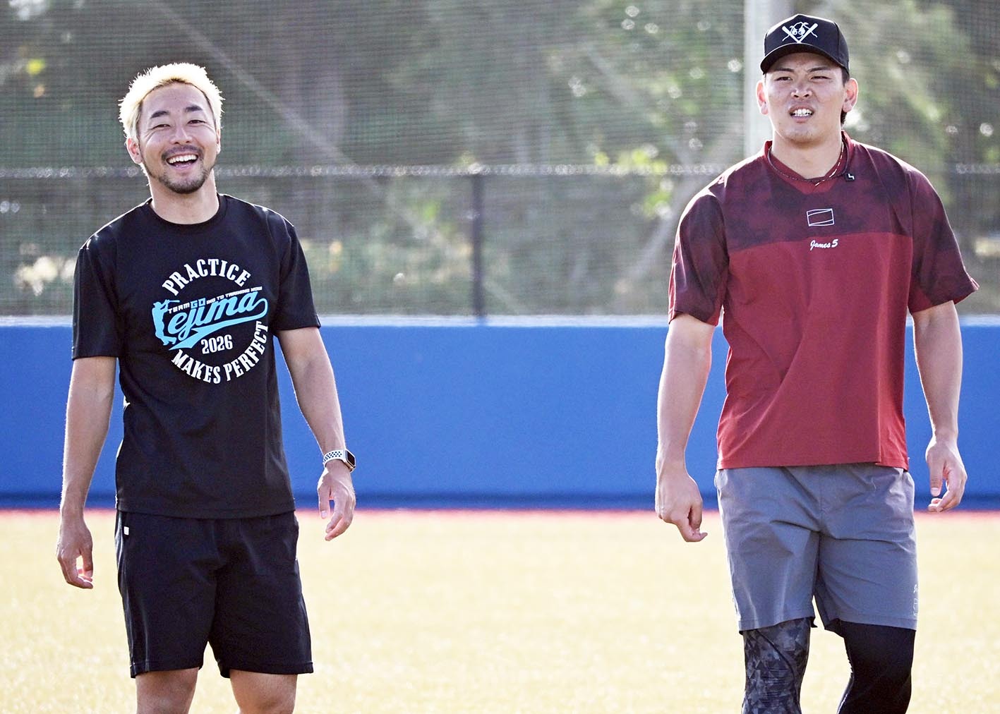 沖縄・伊江島で自主トレを行う野村と茂田井トレーナー(左)=撮影・中田愛沙美
