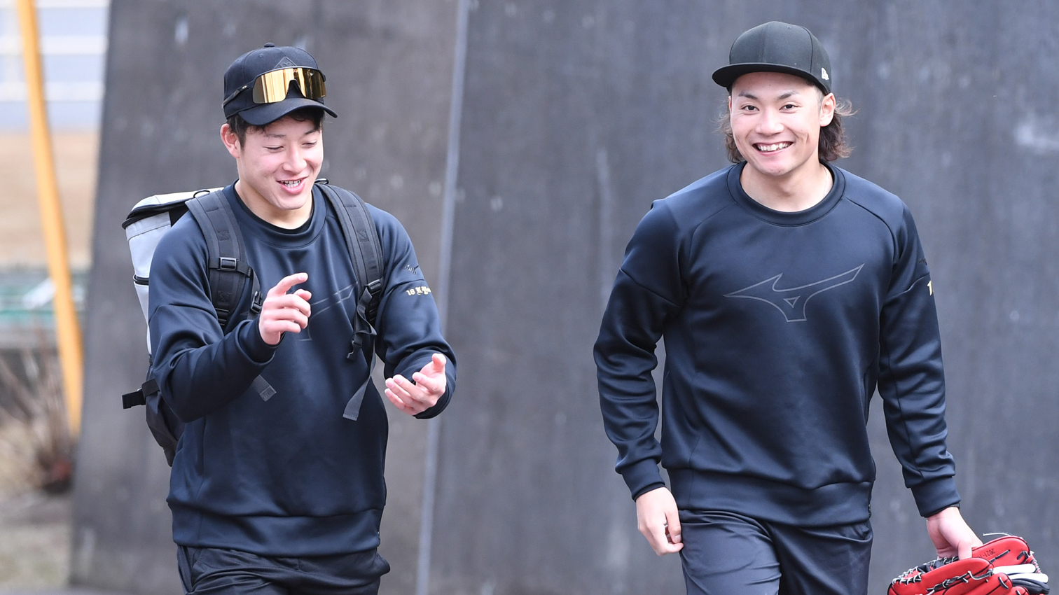 鎌ケ谷で自主トレ中の大卒2年目の伊藤と高卒4年目の吉田が、“双子コーデ”を披露してくれた。上下黒のウエアに身を包み、仲良く一緒に球場入り。ペアルック姿でダッシュやキャッチボールなどを行った。