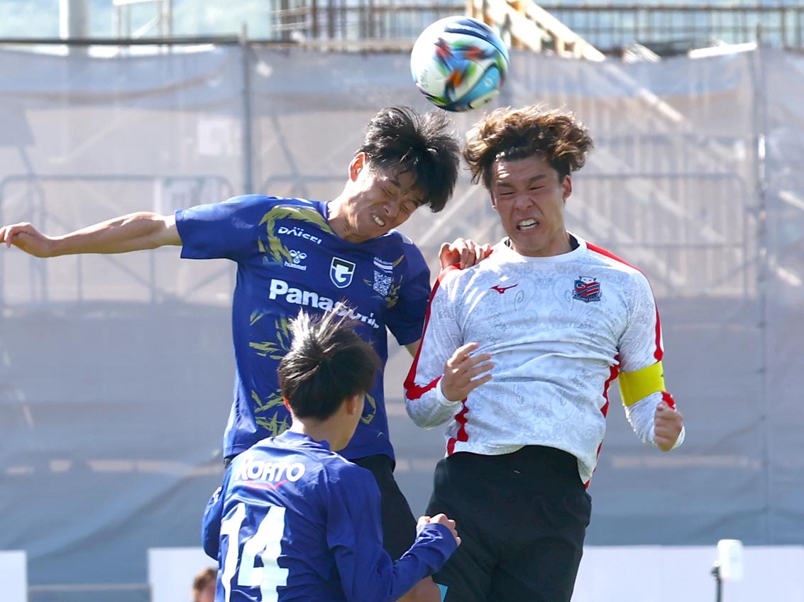 練習試合の3本目、ゴール前でヘディングシュートするDF家泉(右)