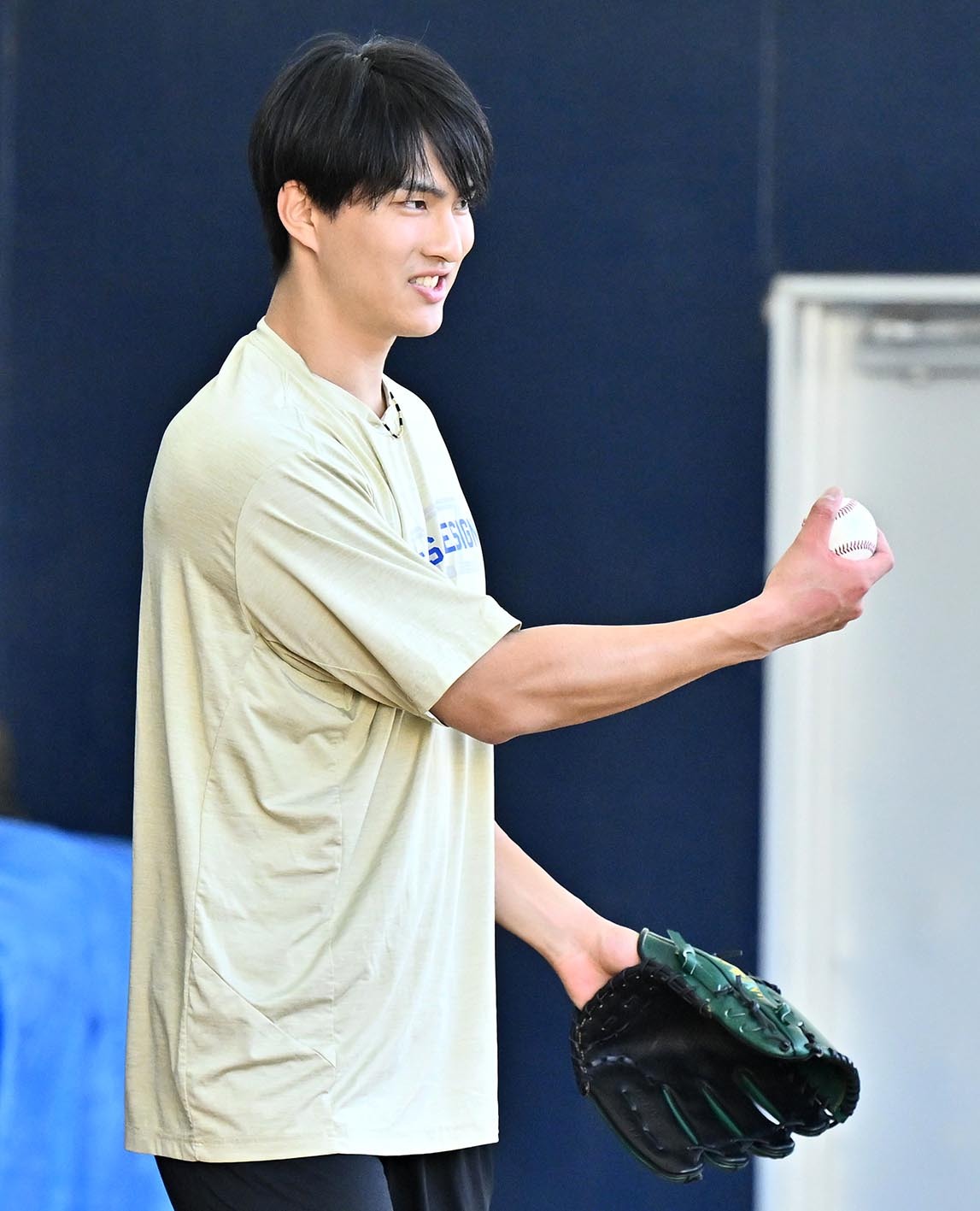 「あれはネタですよ(笑)。まだキャッチボールでしかやっていないです。きょうは普通にスライダーを投げました。でも、久々に龍さん(渡部ブルペン捕手)に受けてもらいましたけど、去年より全然良いって言っていました。スライダーと真っすぐ。チェンジアップ以外は良いと言われたので」
