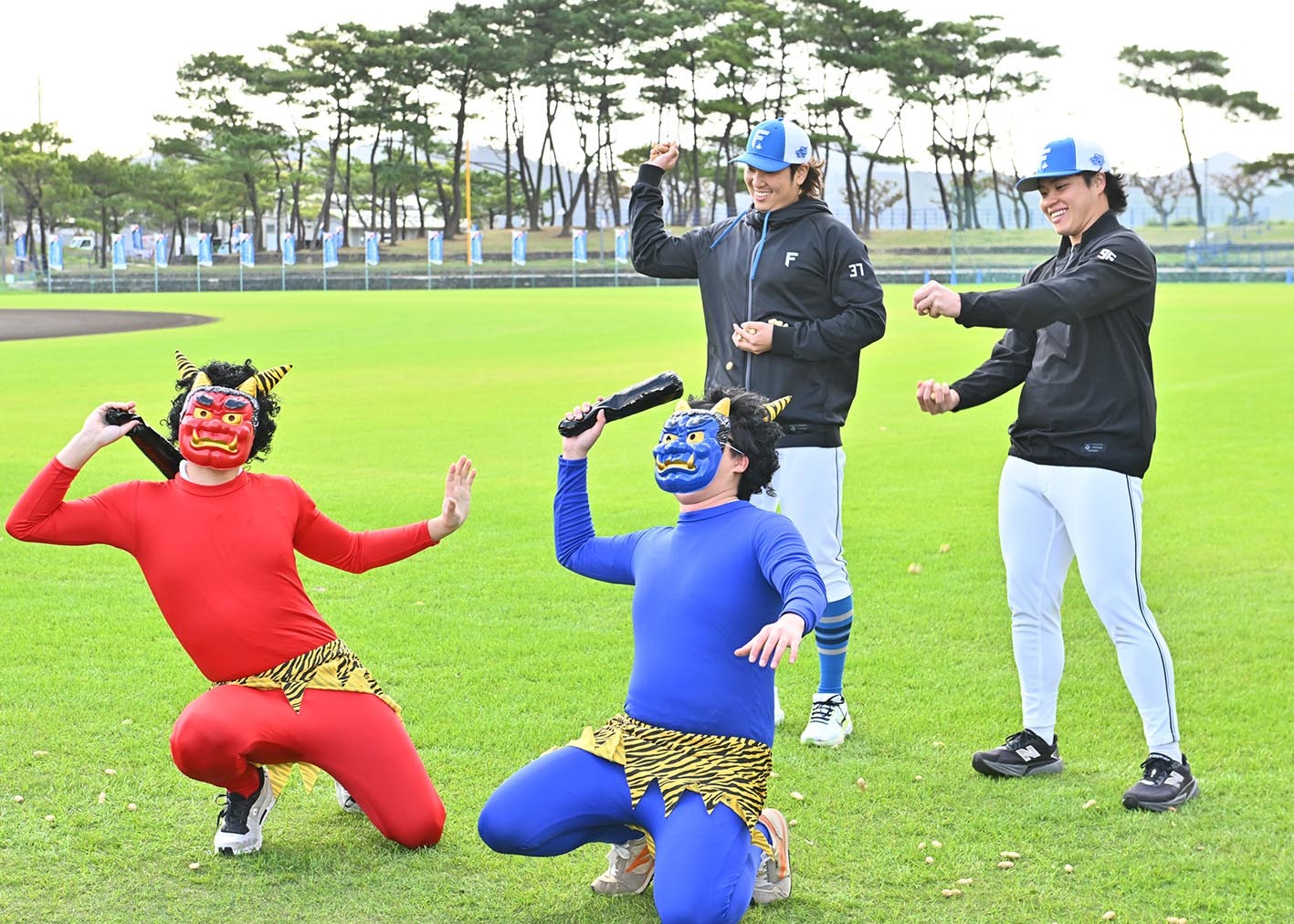 日本ハムの古林睿煬投手(25)と孫易磊投手(20)が3日、1軍キャンプ地の沖縄・名護で節分に合わせて豆まきを行った。台湾出身の右腕コンビは赤鬼と青鬼に落花生をぶつけ、日本の伝統行事を体験した。