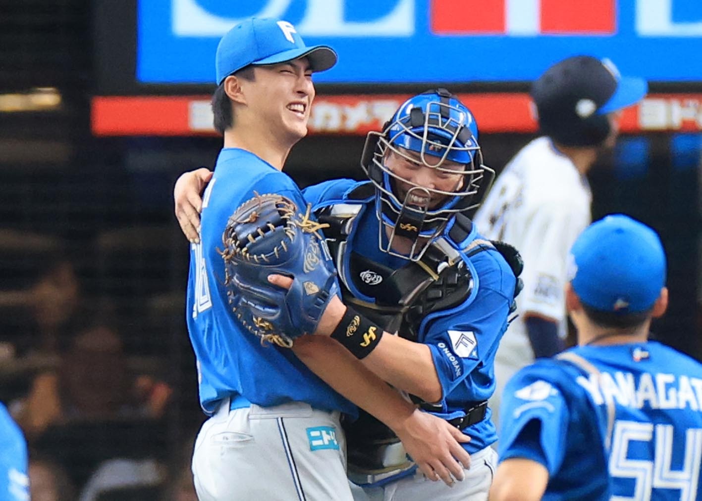 25年6月29日の西武戦でプロ初完投勝利を挙げ、抱き合って喜ぶ達(左)と伏見
