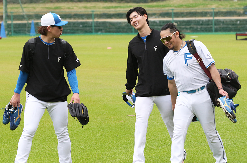 あれから1年。1月にエスコンで一緒に自主トレをした2人の距離は一気に縮まっていた。練習中、話をするシーンも多くなり、そのことを細野に尋ねてみると「仲良くなりましたよ~。大海さん。すごく面倒見てもらいました」とニッコリ。初めて参加した伊藤との自主トレでの出来事も明かしてくれた。