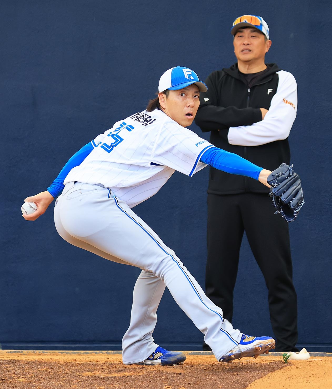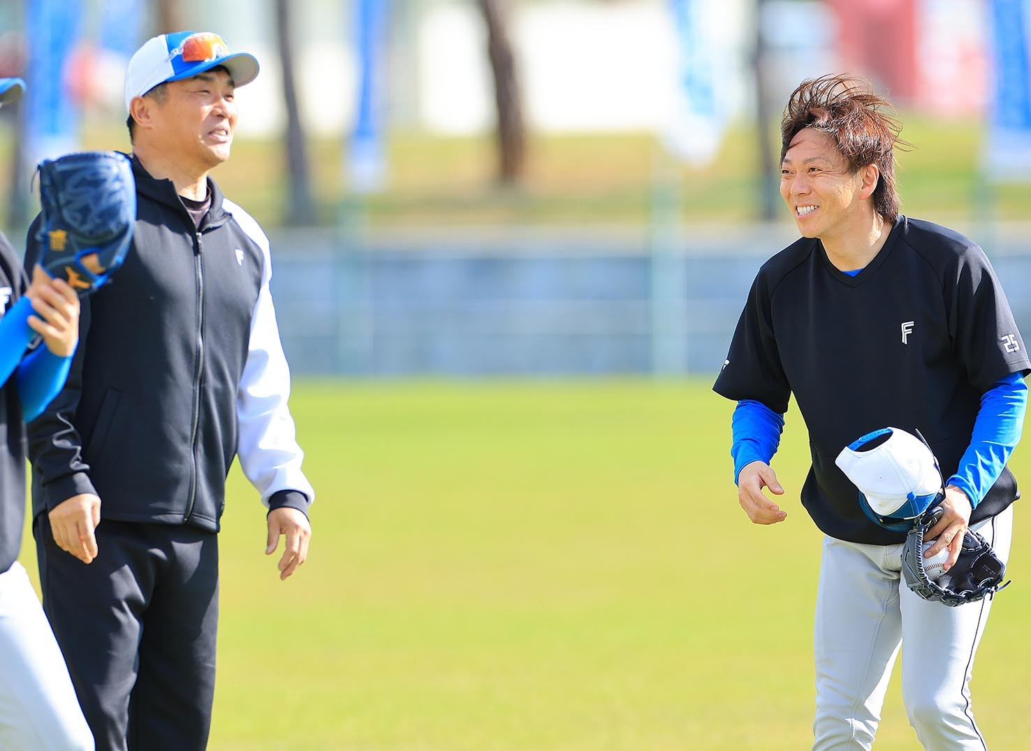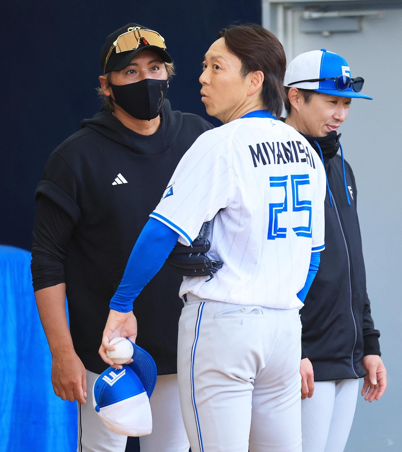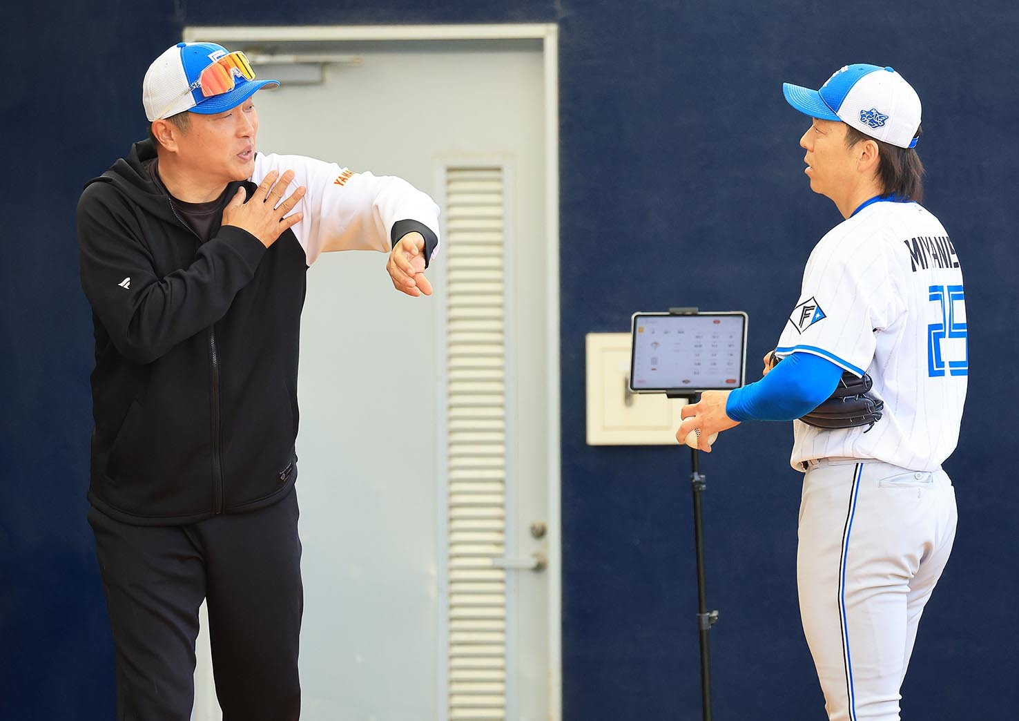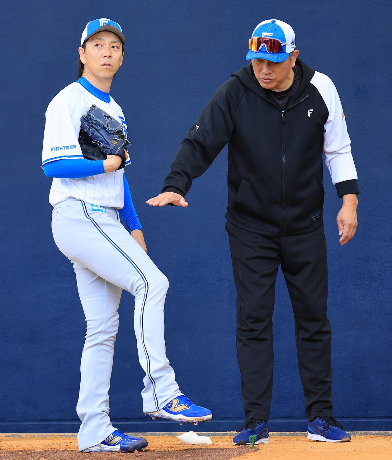 ブルペンで新庄監督(左)に声をかけられる宮西(右)