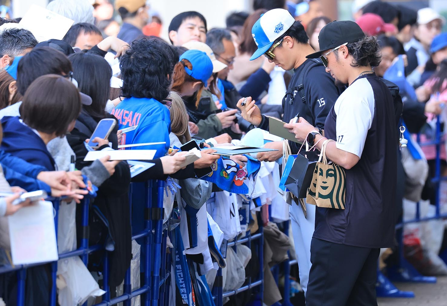 ファンにサインする伊藤(手前右)と北山