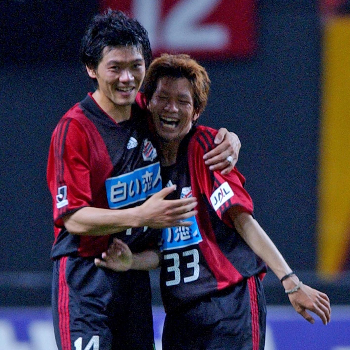 2003年7月2日の大宮戦でプロ初ゴールを挙げたDF岡田(右)が試合後にDF西沢と抱き合う