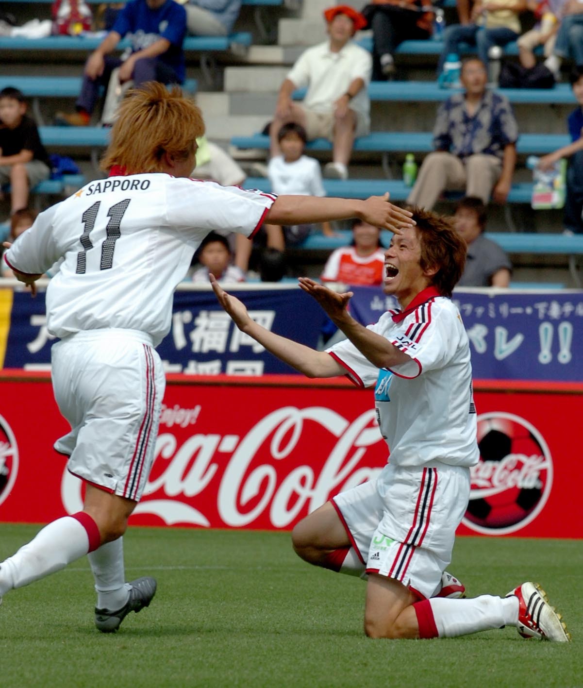 2005年6月18日の福岡戦で先制ゴールを決めたDF岡田(右)とFW相川