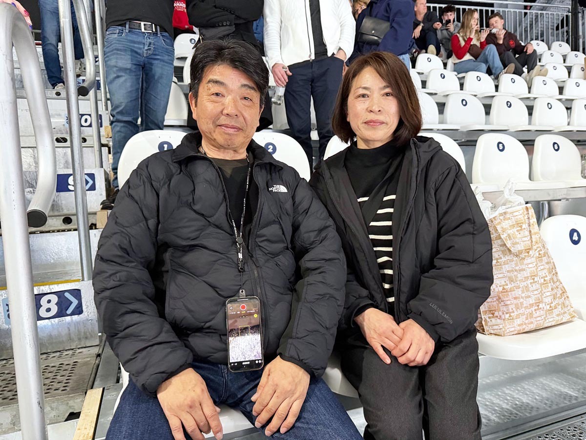 スピードスケート女子団体追い抜きのレースを会場で見守った佐藤綾乃の父・文則さん(左)と母・恵子さん=共同