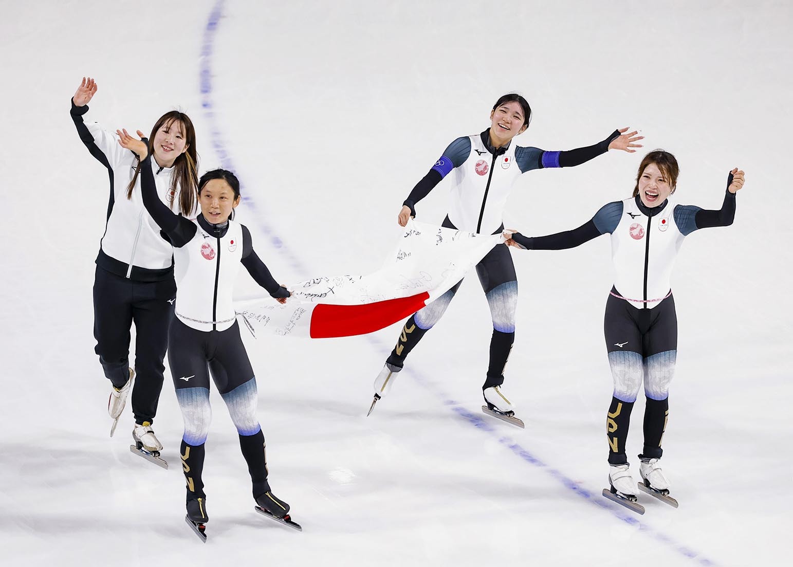 女子団体追い抜きで銅メダルを獲得し、日の丸を掲げ場内を回る(左から)堀川桃香、高木美帆、野明花菜、佐藤綾乃=共同