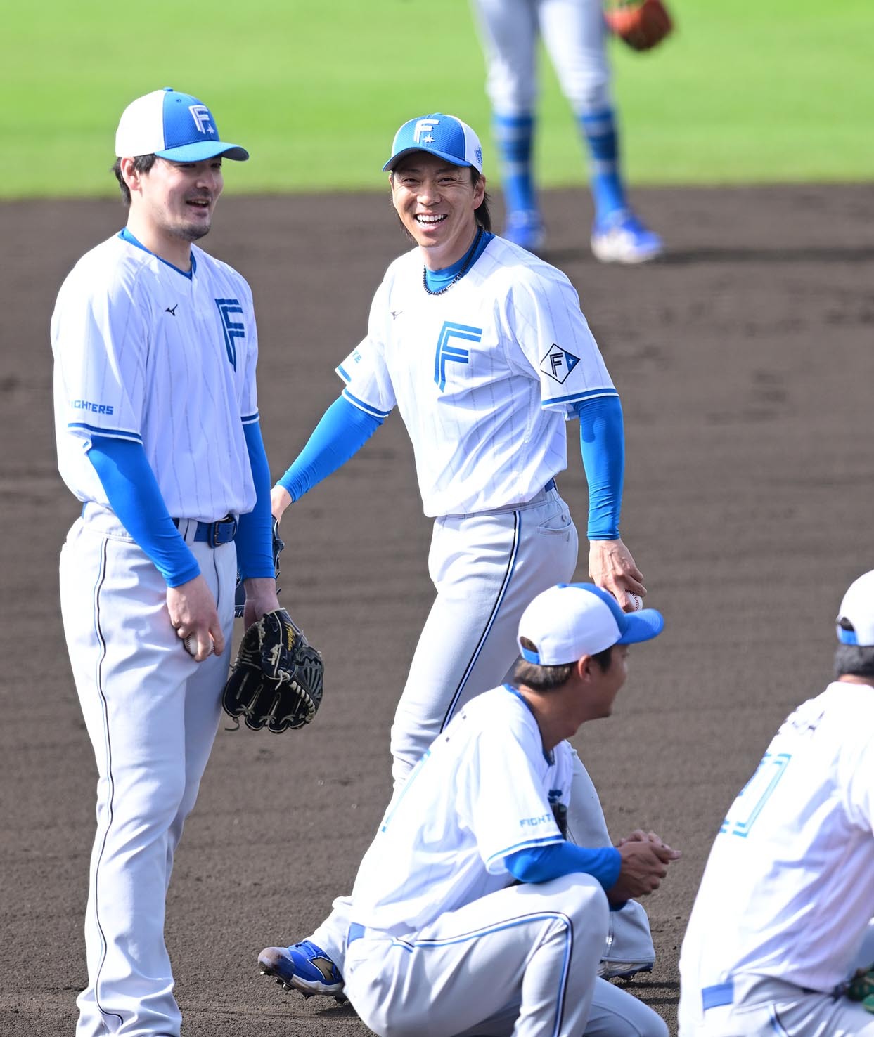 投内連係で笑顔を見せる宮西(中央)と有原(左)