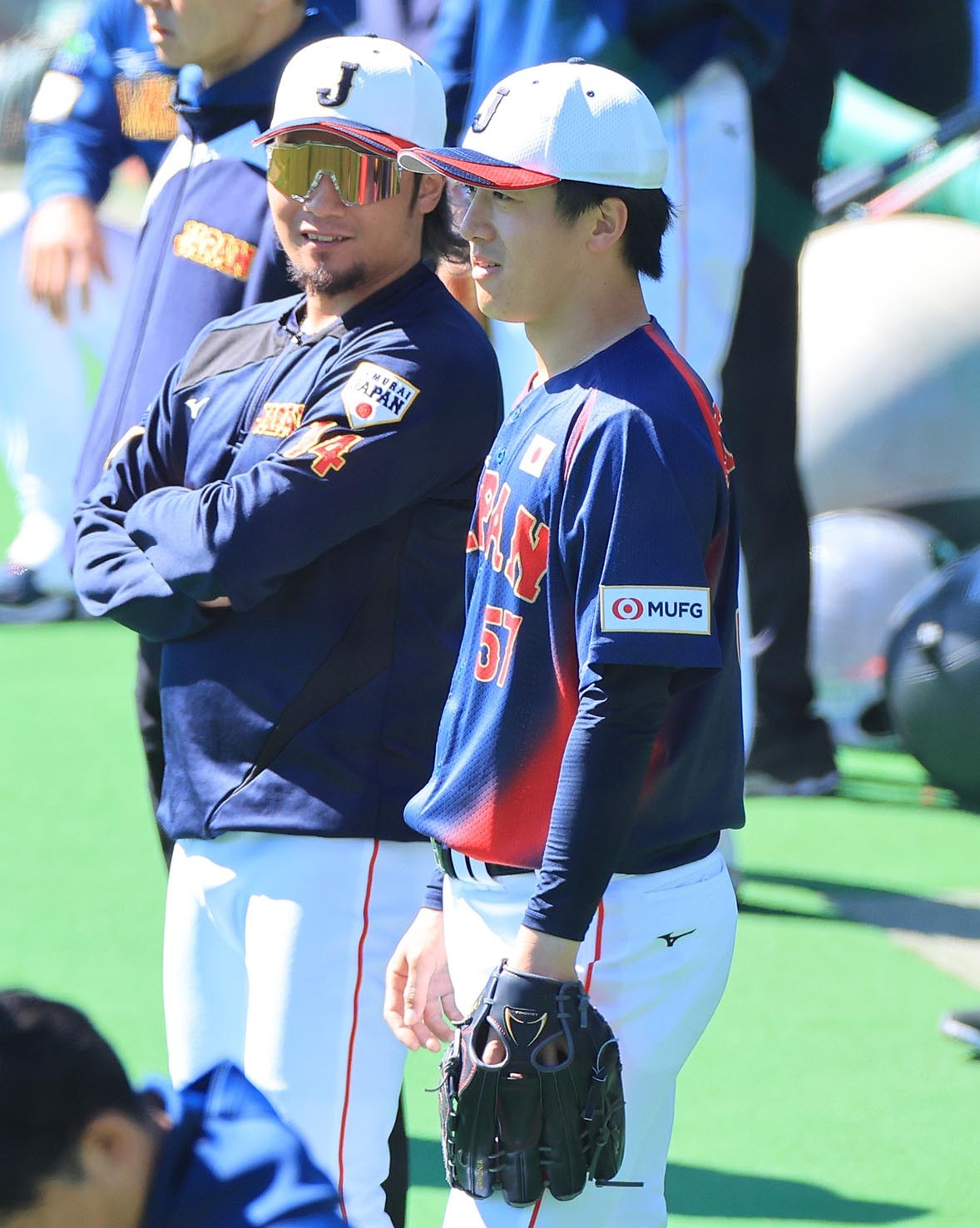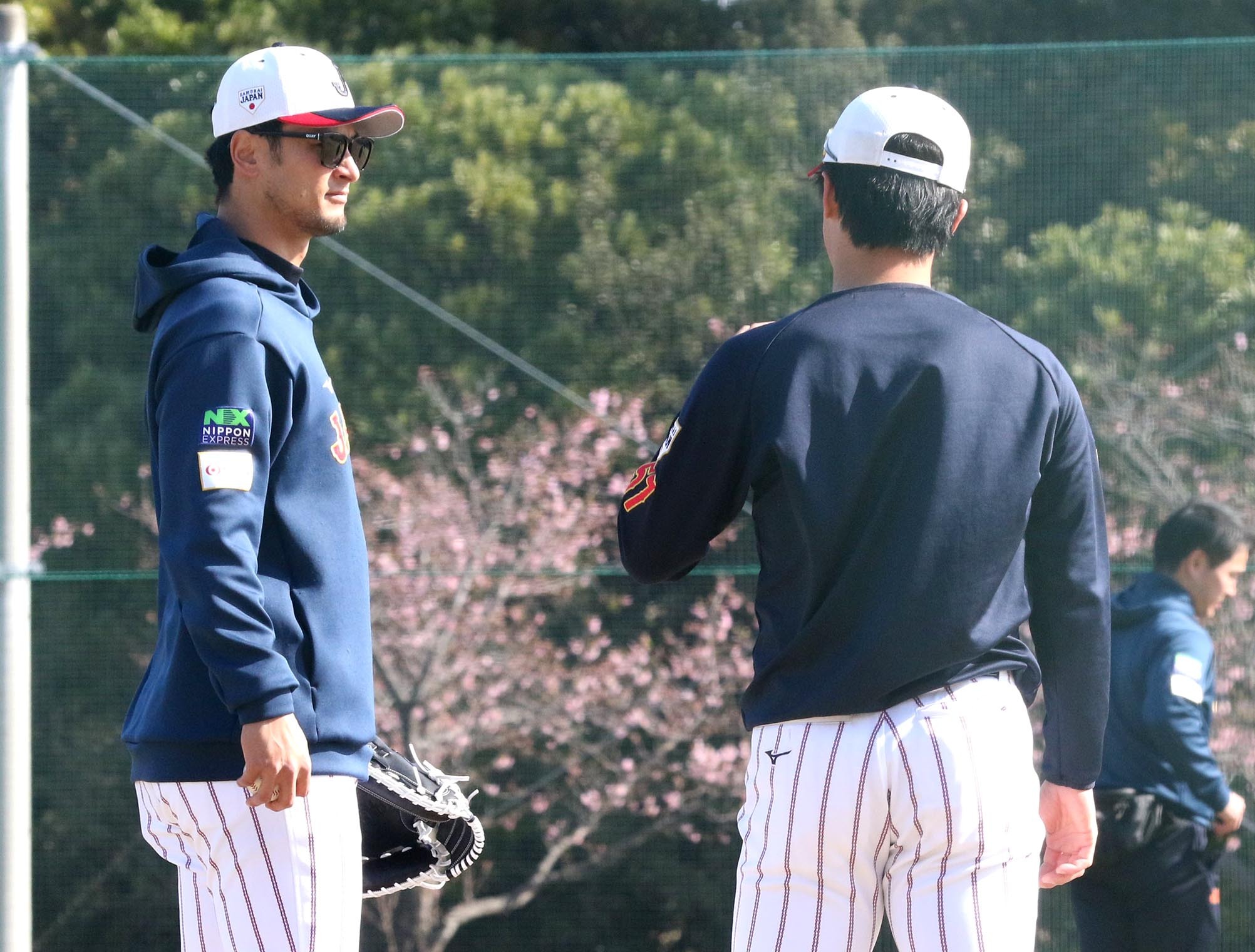 ウオーミングアップ中に言葉を交わす北山(右)とアドバイザーとして参加しているダルビッシュ=撮影・中田愛沙美