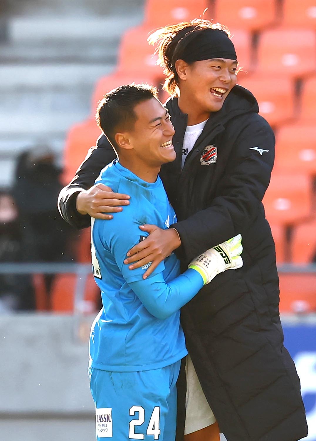PK戦の末に長野に勝利し、DF西野(右)と抱き合って喜ぶGK田川