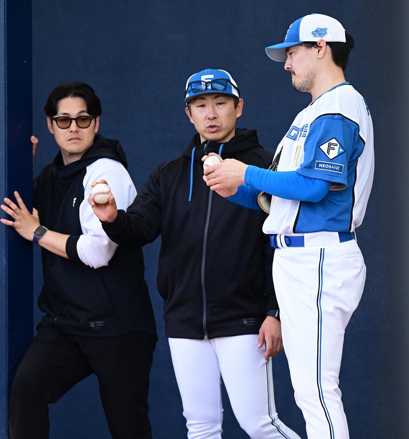 ブルペンで投球練習中に金子コーチ(中央)と会話をする有原(右)