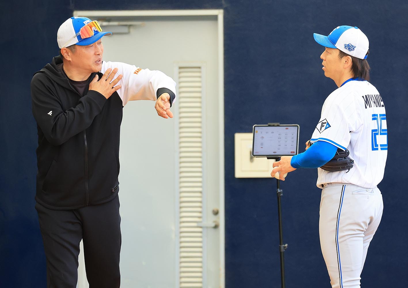 12日のブルペンで、山本昌臨時コーチに指導を受ける宮西(右)