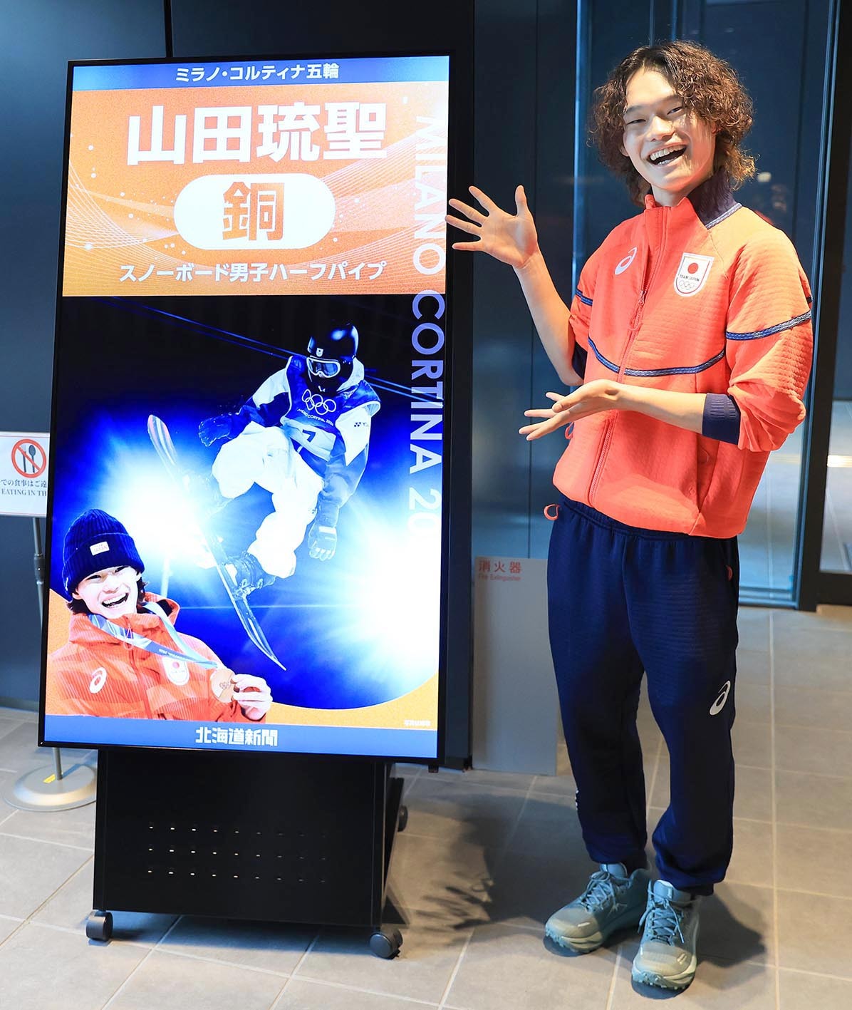 北海道新聞社ロビーに設置されたビジョンの横に立ち、笑顔で記念撮影をする山田琉聖