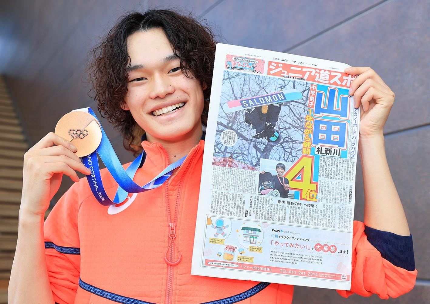 視線は4年後の金メダル! ミラノ・コルティナ冬季五輪に初出場した札幌市出身の山田琉聖(19)=チームJWSC、札幌新川中出=が、スノーボード男子ハーフパイプで銅メダルを獲得した。道産子では男女通じてハーフパイプ初メダル、冬季五輪では道産子最年少の19歳325日でのメダリストとなった。17日に帰国した山田が、地元・北海道で五輪秘話や将来への思いなどをたっぷりと語った。