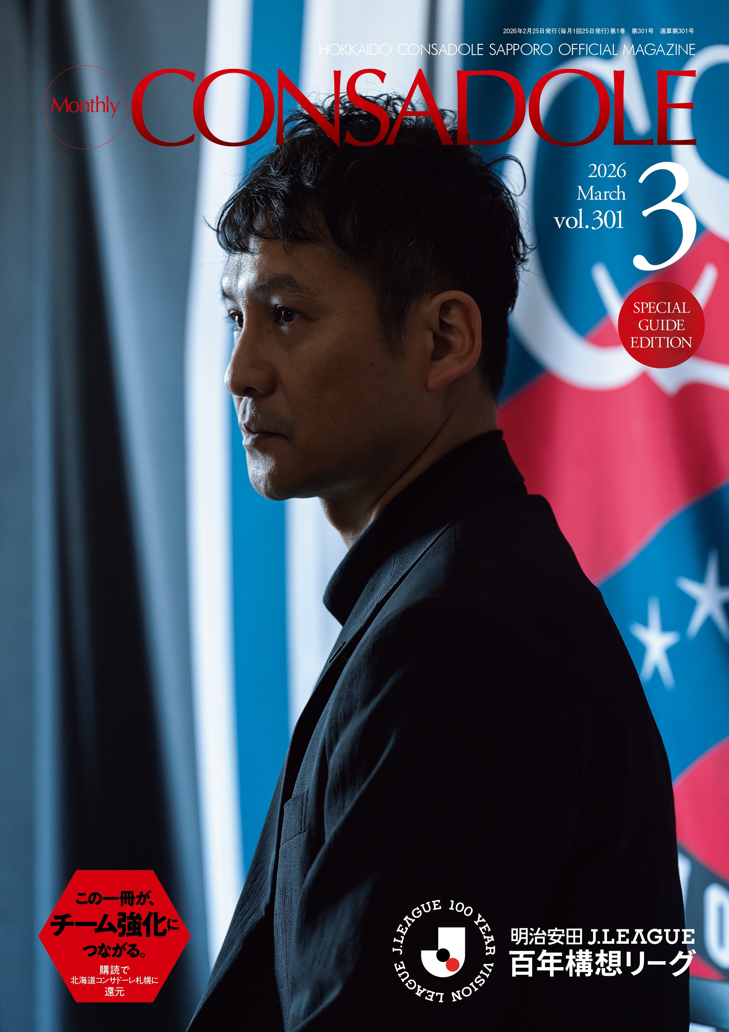 巻頭インタビュー「赤黒の肖像」では川井健太新監督が登場。新天地・北海道での挑戦と、勝利へのロジックを語っている。アカデミー特集「育成の翼~Jへの階段」や、パートナー企業・セコマのインタビューも掲載し、クラブの現在地と未来像に迫る。そのほか木村真穂さんのコラム、サポーター参加型企画「12番目の日常」、月刊コンサドーレ25周年アンケート募集も実施した。