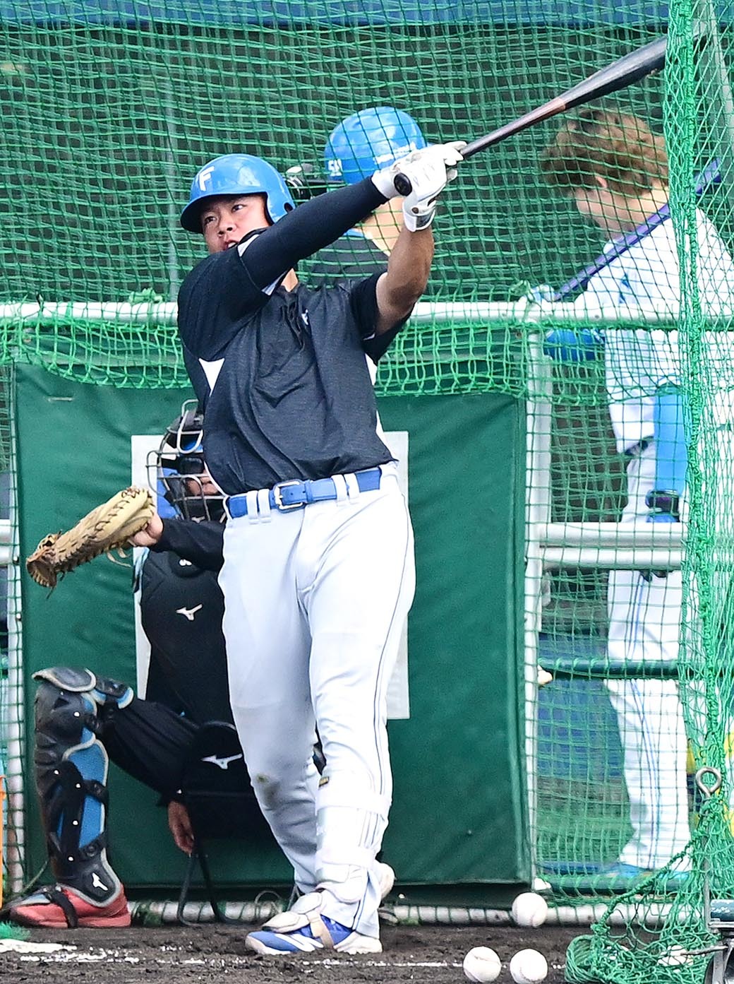 新庄監督が見守る中、フリー打撃をする吉田=撮影・小田岳史