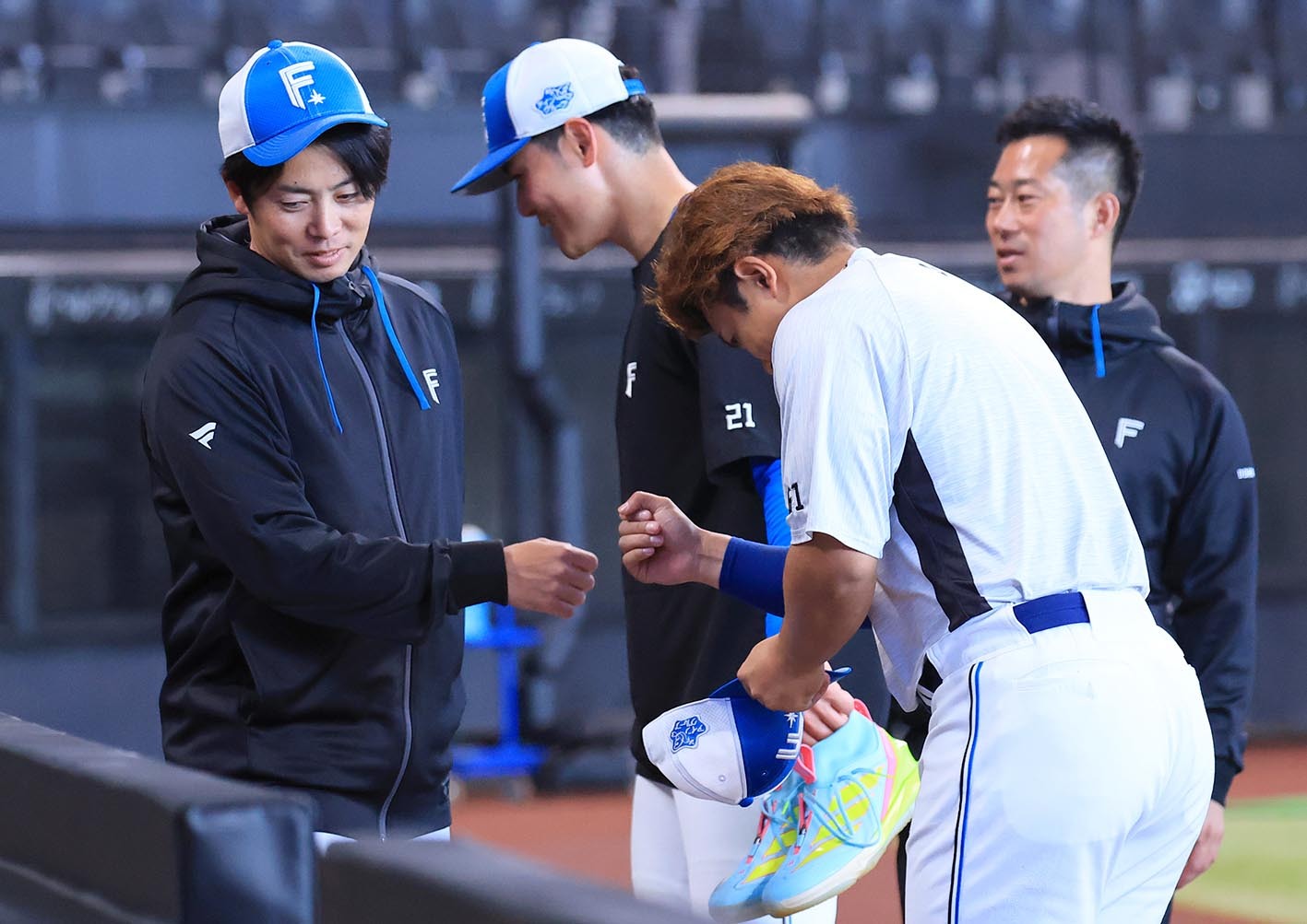 谷内コーチ(左)とグータッチをする今川