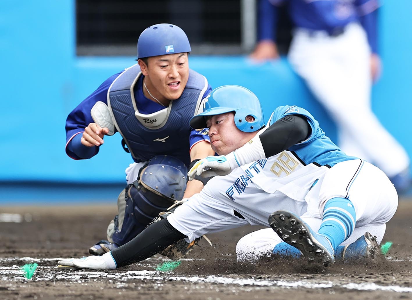 2月20日の2軍練習試合、中日戦で捕手をかいくぐりホームインする梅林(右)