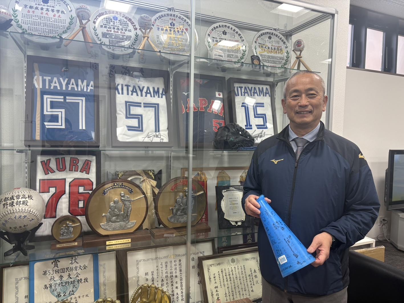 当時の監督、松井常夫さん(61)は2024年に退任し、現在は総監督。「これは、僕が棺桶に入れてくれと言っているやつなので」。教え子たちの思いが詰まったメガホンを大切に持っている。北山が3年だった夏の京都府大会、決勝前の控え室でメンタルトレーニングの一環として選手たちに「ナンバーワン宣言を書かせていた」。当時、エースで主将だった右腕が書いた言葉は「楽しむ #1」。インクが薄くなった文字が味わい深いメガホンを見つめながら、思い出を振り返ってくれた。