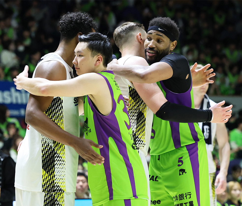 試合終了後、SR渋谷の選手と健闘をたたえてハグするSG富永(左から2人目)とPFジョーンズ(同4人目)