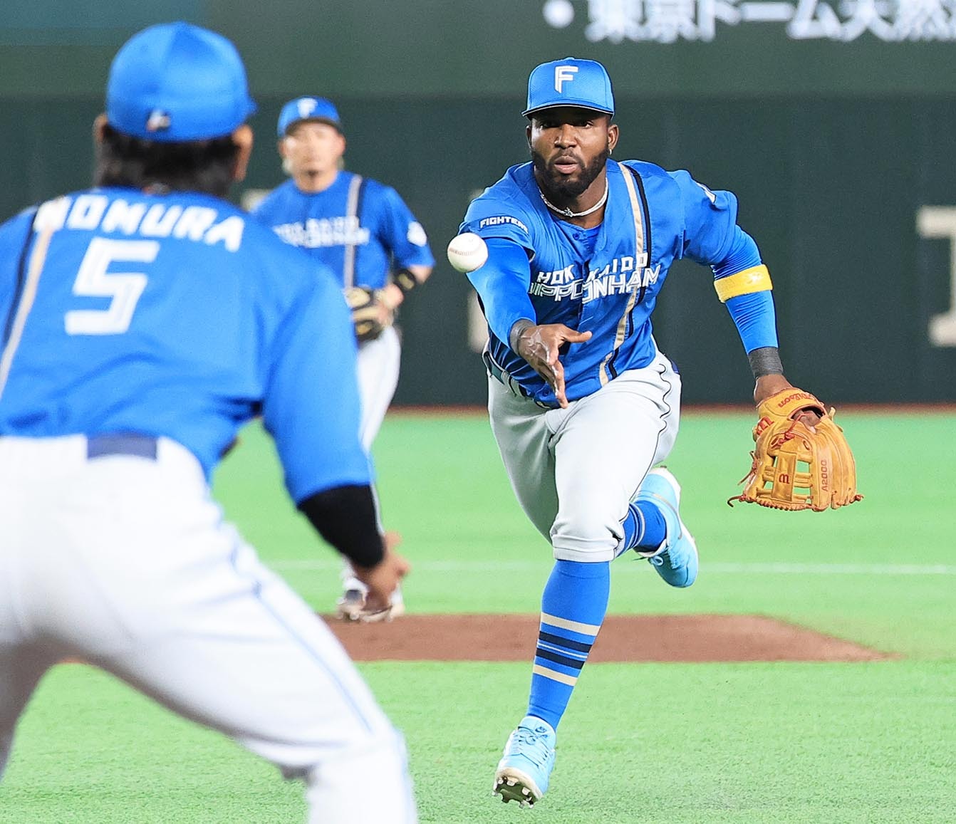 一回2死二塁、巨人・キャベッジの打球を処理するカストロ(右)。中央は水野=撮影・井上浩明