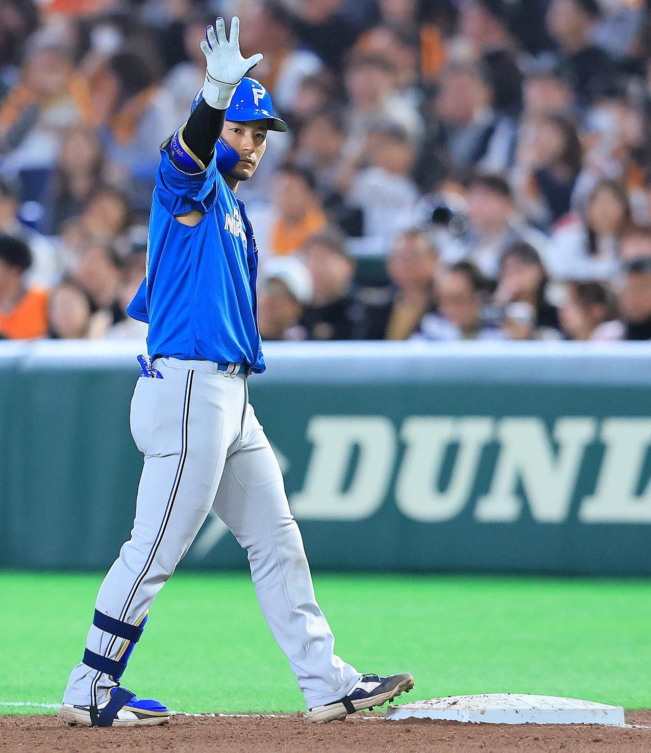 四回1死満塁、適時打を放った水野が塁上で手を叩く